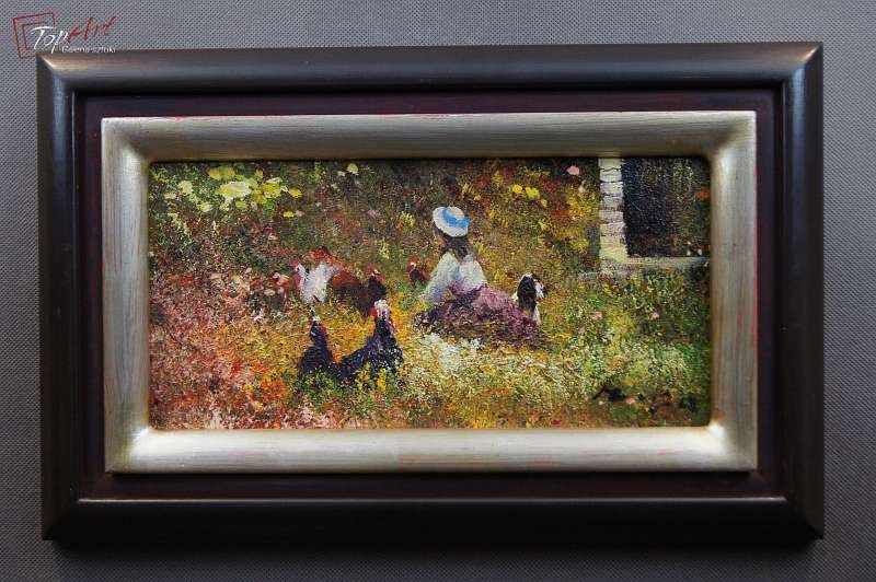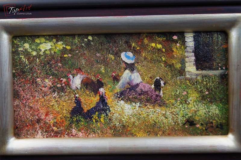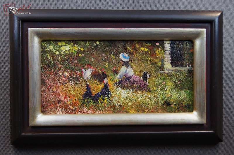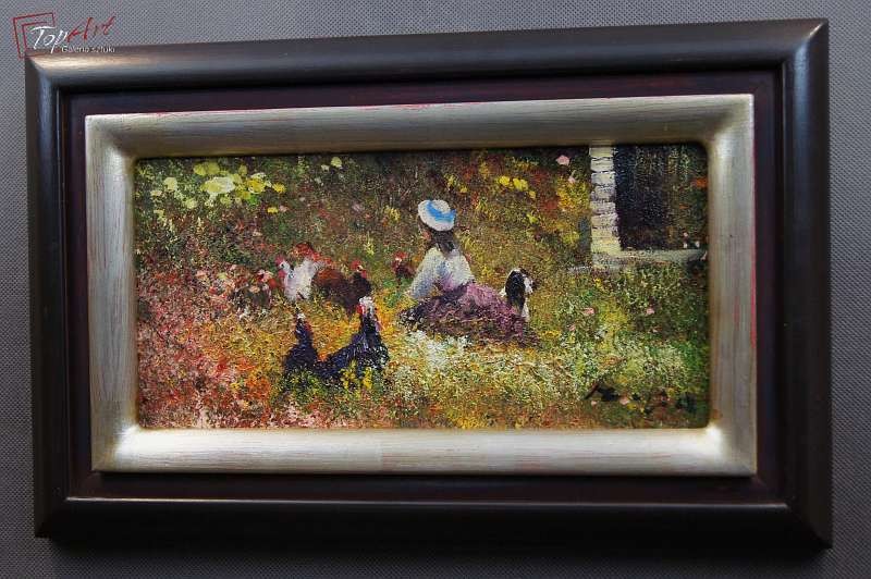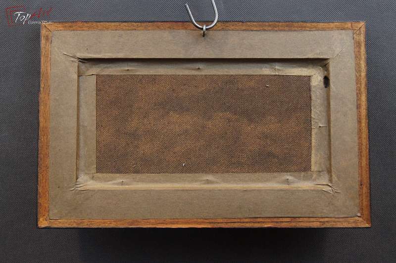 Nieduży oryginalny dekoracyjny obraz, Malowany farbami olejnymi na płycie pilśniowej. Pochodzi z 70 lat 20 wieku. Sygnowany przez artystę w prawym dolnym rogu. Autorem tej pracy jest nieznany malarz. Obraz malowany w technice pędzla tak zwane tipowanie, oprawiony w oryginalną ramę. Przedmiot do powieszenia na ścianie. Nie wymaga jakichkolwiek ingerencji Stan zachowania - sygnatura nie rozczytana bardzo dobry. Wymiary: całości z ramą 26 cm x 41 cm, obraz 14,5 cm x 29,5 cm.