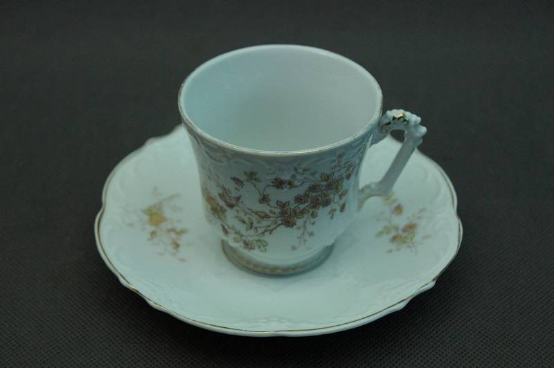 WYMIARY: wysokość filiżanki z uchwytem 7,5 cm, średnica filiżanki 8 cm, średnica talerzyka 15,5 cm.