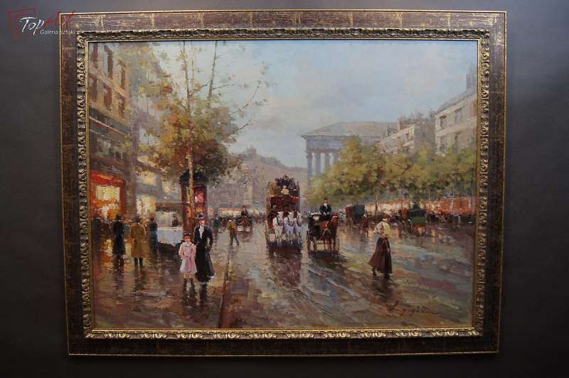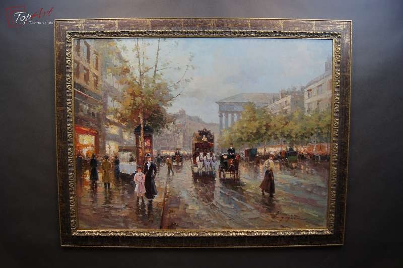 Oryginalny,niezwykle dekoracyjny, obraz olejny bardzo dużych rozmiarów, malowany w stylu impresjonistycznym farbami olejnymi na płótnie, przedstawiający spacer ulicą przedwojennego Paryża w latach dwudziestych .Artysta w owym dziele pokazuje niezwykłą grę kolorów. Technika malarska:pędzel,szpachla.Sygnowany prawy dół L.Joyce. Obraz pochodzi z lat osiemdziesiątych XX w. Liryczny spacer po Paryżu będzie niezwykłym dodatkiem aranżacyjnym i upiększy każde wnętrze.Całość oprawiona w oryginalną,przepiękną,przestrzenną ramę. Stan zachowania idealny,nie wymaga jakichkolwiek interwencji. Wymiary całości z ramą 108 cm x 138 cm,płótno 90 cm x 120 cm.