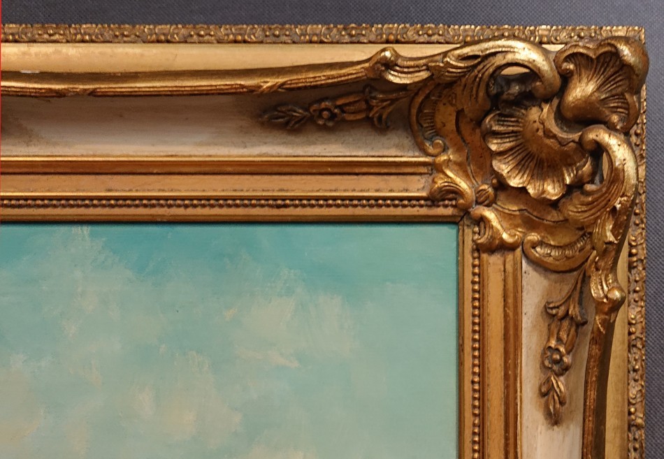 Dzieło o wyjątkowych walorach dekoracyjnych zostało oprawione w luksusową, klasyczną ramę w kolorze antycznego złota. Szeroki profil ramy z eleganckimi frezowaniami podkreśla prestiżowy charakter malarstwa lat 50. Zarówno warstwa malarska, jak i oprawa zachowane są w nienagannym stanie. Obraz jest gotowy do natychmiastowej ekspozycji, nie wymagając żadnych nakładów konserwatorskich.