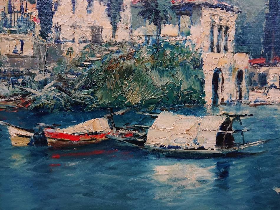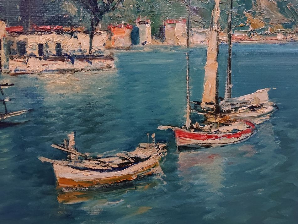 Obraz przedstawia fragment nadbrzeżnej architektury, gdzie historyczne budynki niemal wyrastają z błękitnej tafli jeziora Lugano. W oddali majaczą zarysy przeciwległych brzegów, budując niesamowitą głębię perspektywy. Centralnym punktem są łodzie zacumowane przy brzegu – motyw, który Hellmeier opanował do perfekcji. Gra cieni na murach i błękit wody tworzą harmonijną kompozycję, która wprowadza do wnętrza elegancję, spokój i powiew wakacyjnej przygody.