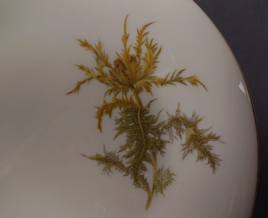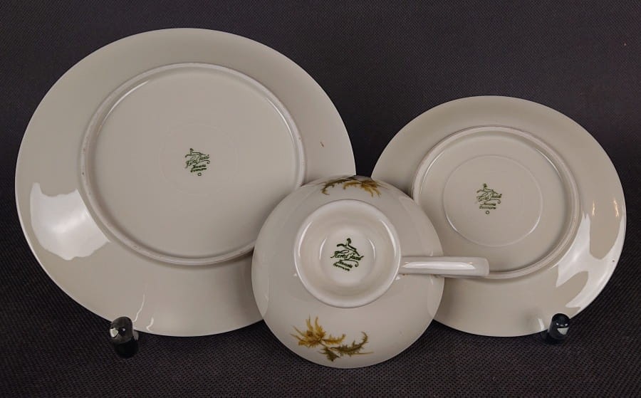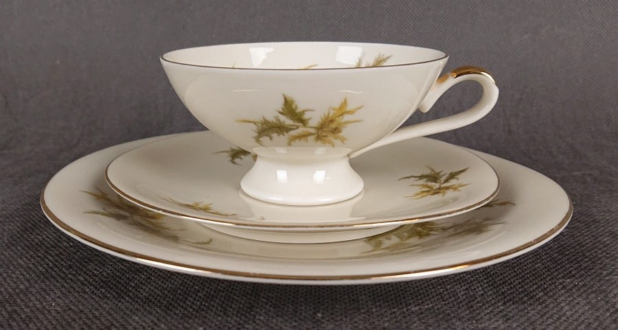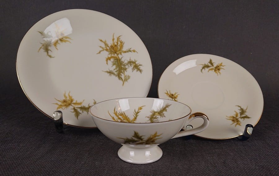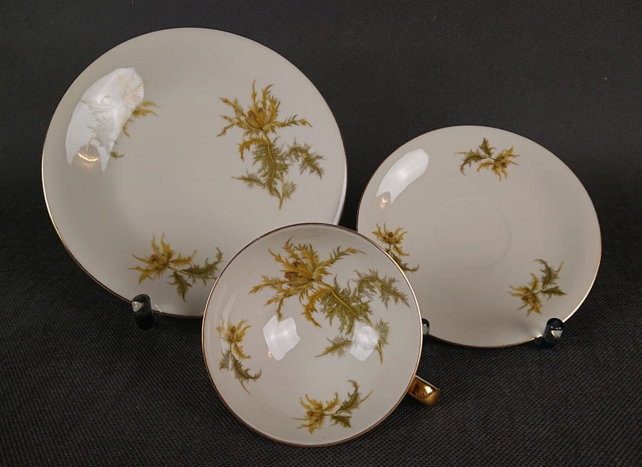Porcelanowy zestaw śniadaniowy z niemieckiej fabryki porcelany Hertel Jacob & Co. to elegancki komplet składający się z filiżanki, spodka i talerza deserowego. Wszystkie elementy wykonane są z białej, szkliwionej porcelany i zdobione motywami ostów lub stylizowanych roślin w odcieniach żółci, brązu i zieleni, a także złotymi akcentami.