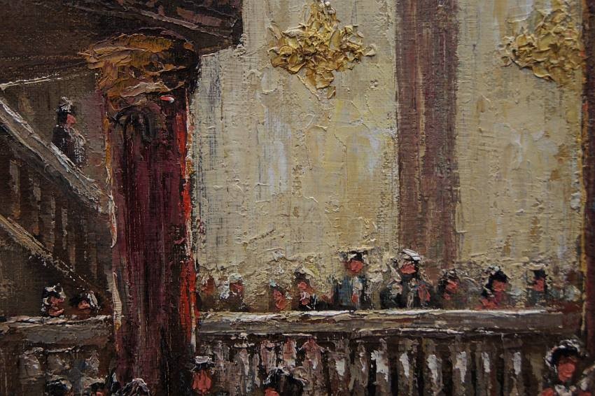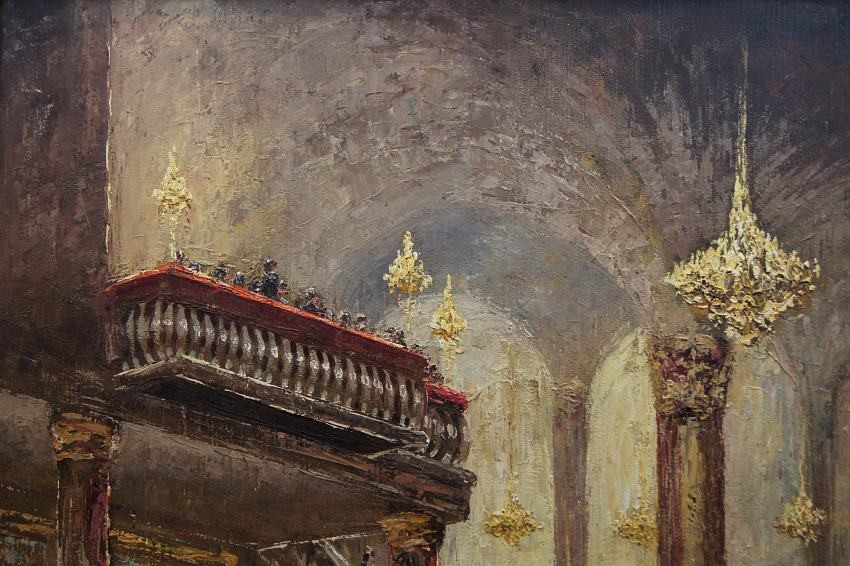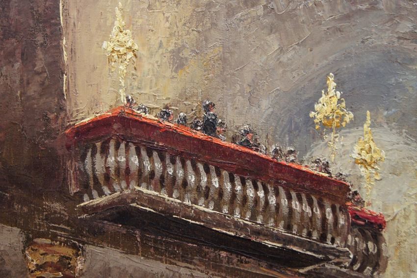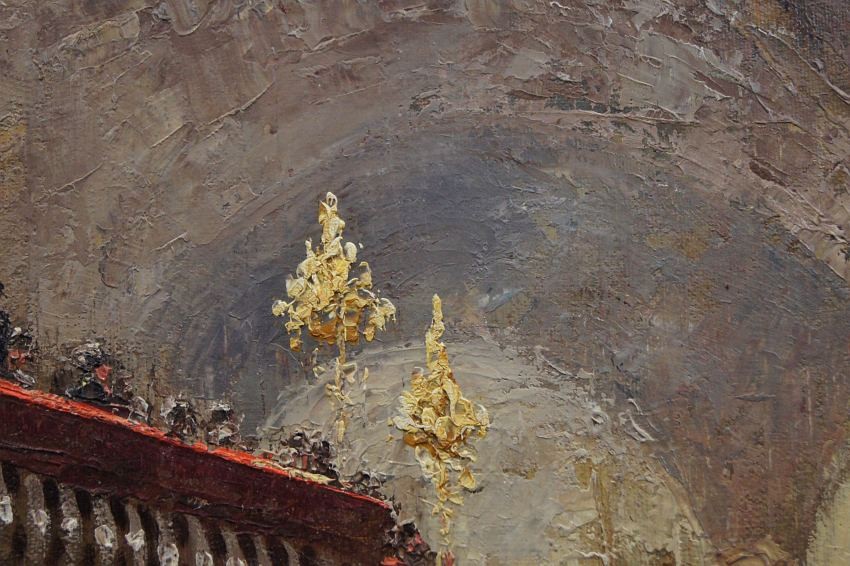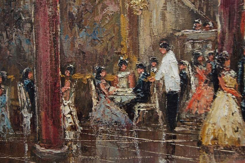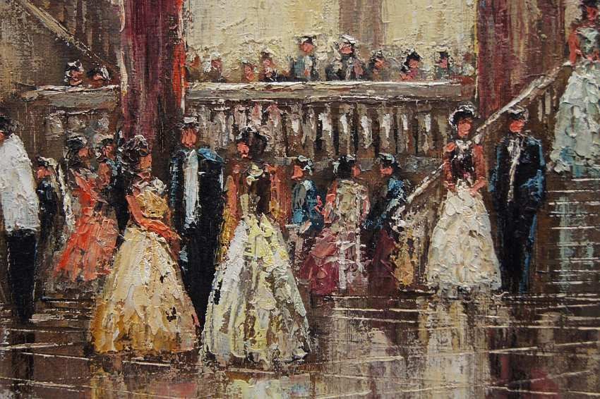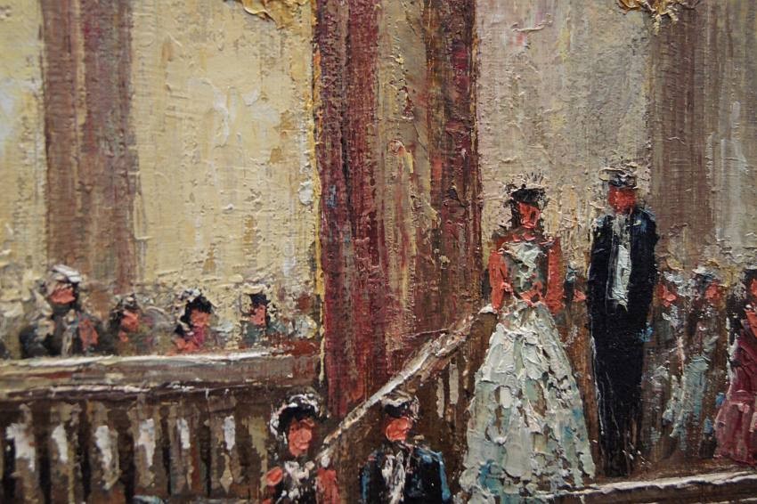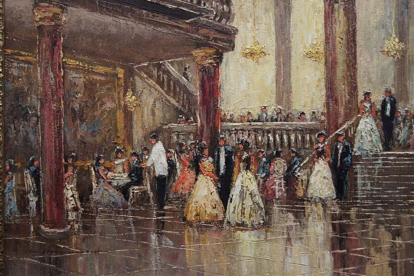 Impresjonistyczne dzieło sztuki w ofercie naszego sklepu. Obraz znanego niemieckiego impresjonisty. Namalowany został na płótnie naciągniętym na krośnie. Tworzony śmiałymi pociągnięciami szpachli malarskiej, z niezwykłą precyzją i dbałością o wszystkie szczegóły. Praca niezwykle barwna, przedstawiająca bardzo duże walory artystyczne i dekoracyjne. Autor na tym obrazie prezentuje pałacową salę balową oświetloną dużymi kryształowymi żyrandolami, która wypełnioną jest licznymi postaciami w wytwornych kreacjach.