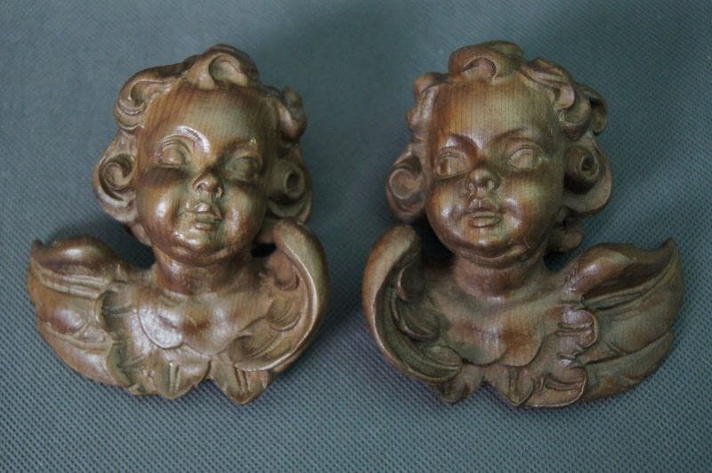 Amorki, aniołki, wyrzeźbione w drewnie dwie główki prawa i lewa, wykończone politurą i woskiem. Przedmioty ręcznie wyrzeźbione w drewnie, odzwierciedlający liczne szczegóły. Pochodzą z Tyrolu niemieckiego lub włoskiego. Wykonane w latach 60, XX wieku.