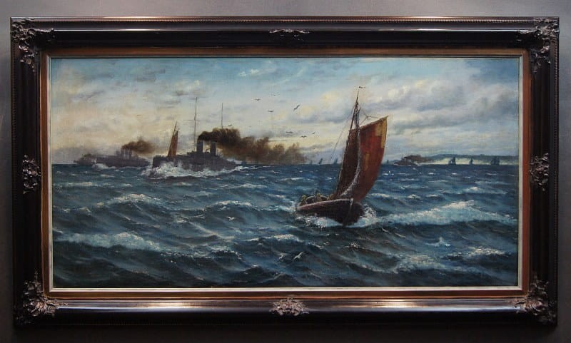 To kolejny bardzo dobry przykład malarstwa marynistycznego. Jest to morski pejzaż pełen ruchu i życia przedstawiający parowce i kutry rybackie. Piękna, profesjonalna, autentyczna praca olejna, namalowana na płótnie, nieznanego artysty który postrzegał uroki morza i przelewał je na płótno.