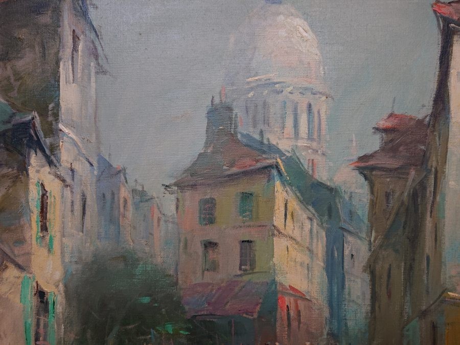 Obraz przedstawia widok na paryską ulicę w dzielnicy Montmartre. W tle góruje monumentalna, jasna kopuła bazyliki Sacré-Cœur.