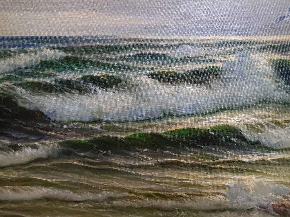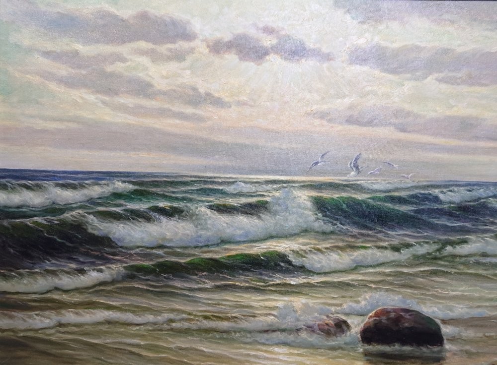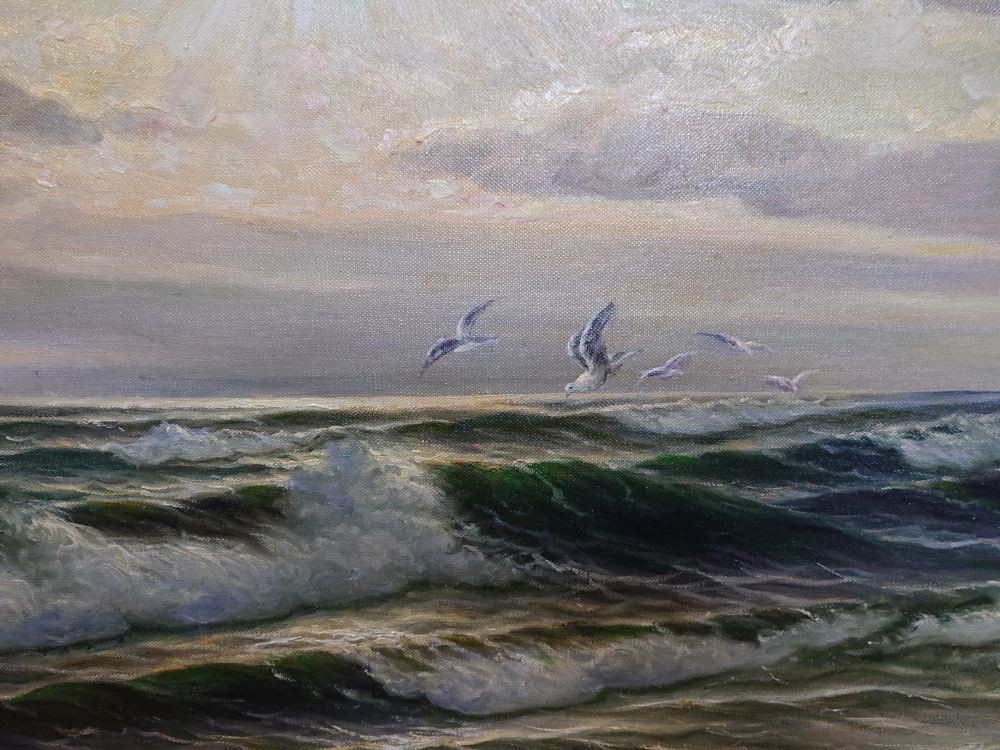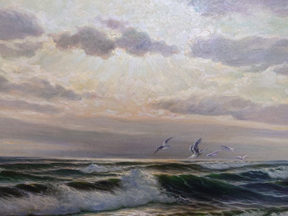 Kunszt, który zachwyca koneserów na całym świecie Twórczość Paula Heinza Olbricha cieszy się niesłabnącym uznaniem na międzynarodowych wystawach, a jego prace stanowią perły w wielu prywatnych kolekcjach w Europie. Obraz charakteryzuje się brawurowym operowaniem paletą barw – od głębokich granatów i zieleni morskiej toni, po subtelne biele i szarości chmur. Olbrich, regularnie podróżujący nad Bałtyk w poszukiwaniu inspiracji, zdołał uchwycić na tym płótnie to, co w marynistyce najtrudniejsze: ruch wody i zmienność morskiej aury. To malarstwo, które „żyje” w zależności od kąta padania światła, wprowadzając do pomieszczenia wyjątkowy, ekskluzywny klimat.
