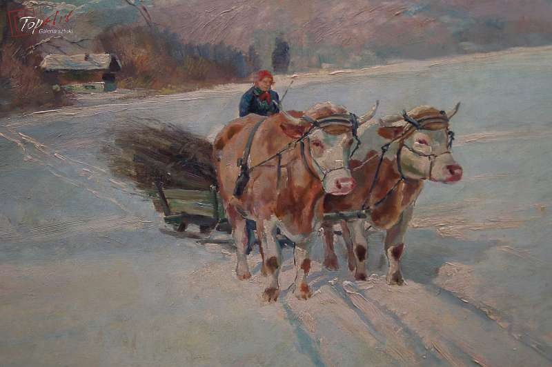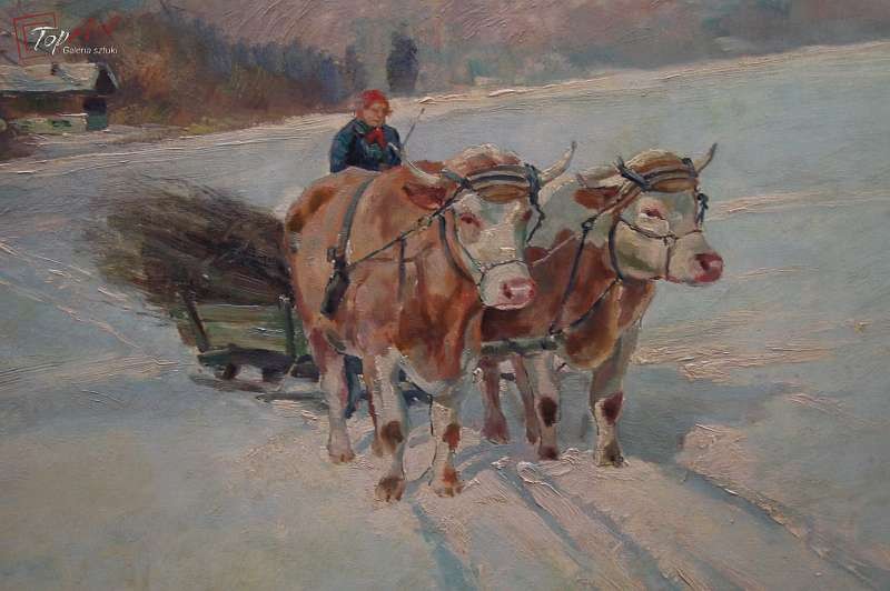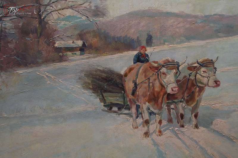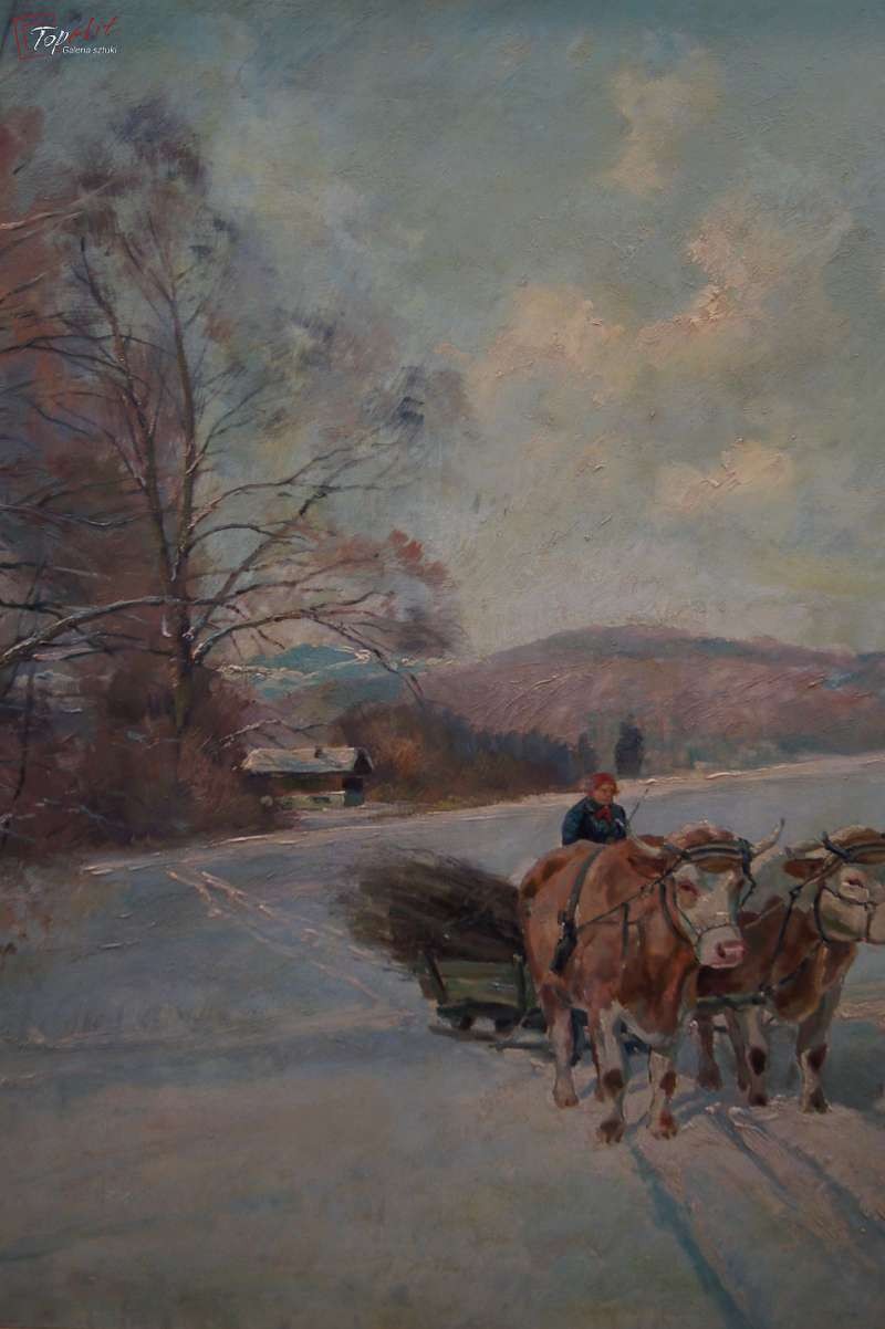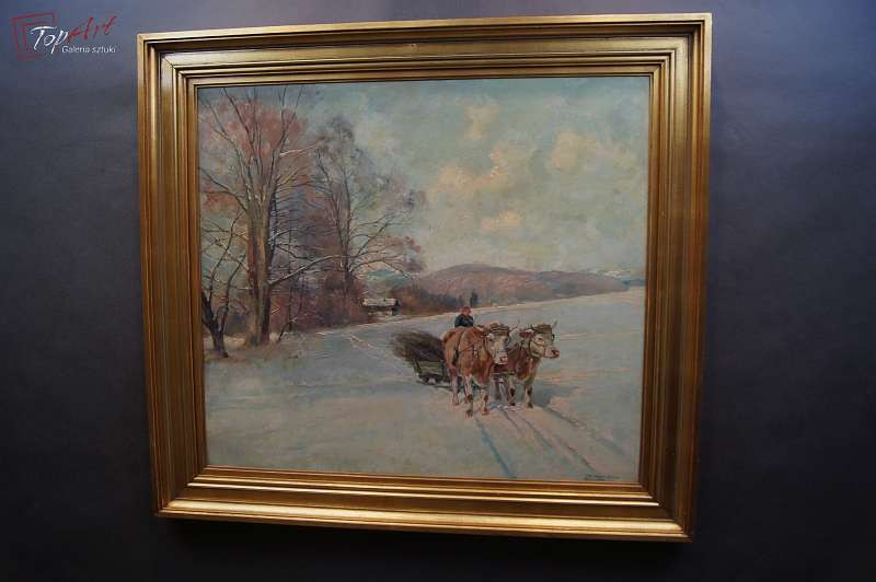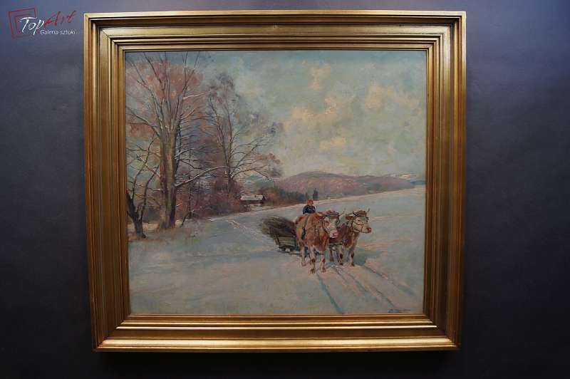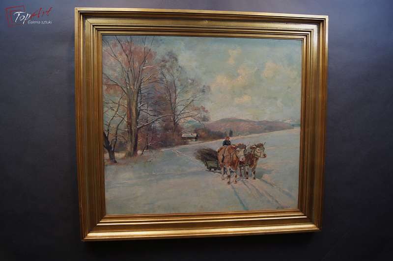 Bardzo duży autentyczny, niezwykle dekoracyjny, profesjonalnie namalowany obraz olejny na grubej sklejce, przedstawiający zimową scenę z życia "Zwózka drewna" . Jedno z lepszych dzieł tego autora. Autorem tej pracy jest Paul Johann Walch . Obraz malowany w technice pędzla, struktura nałożonej farby wyczuwalna pod palcami. Artysta na obrazie przedstawia typową dla swojej twórczości prace. Sygnowany prawy dół : Paul Johann Walch ( miejscowość nieczytelna, data najprawdopodobniej 1935 ). Obraz oprawiony jest w przepiękną, przestrzenną ramę z okresu powstania. Dzieło polecamy koneserom cennego i dobrego malarstwa. Portal notowań aukcyjnych Artprice odnotowuje 233 sprzedanych obrazów tego artysty. Stan zachowania bardzo dobry. Nie wymaga ingerencji, do powieszenia na ścianie.. Wymiary: całości z ramą 99 cm x 109 cm, obrazu 80 cm x 90 cm.