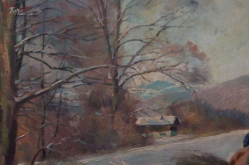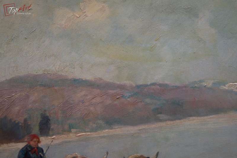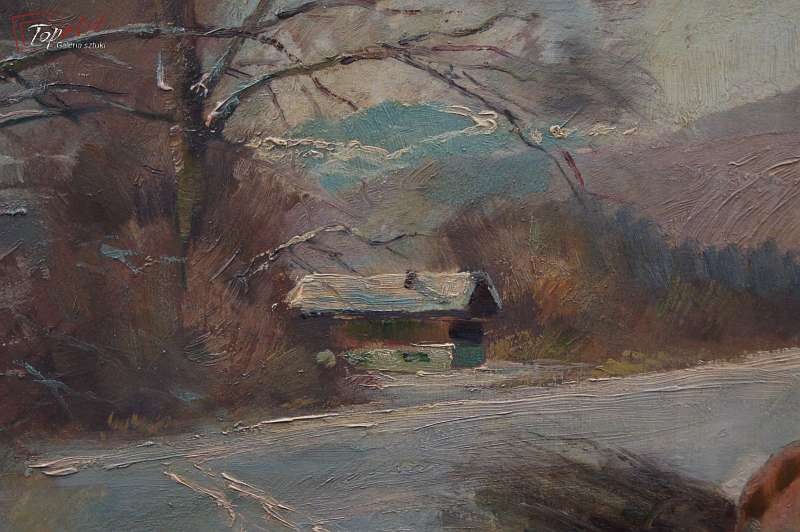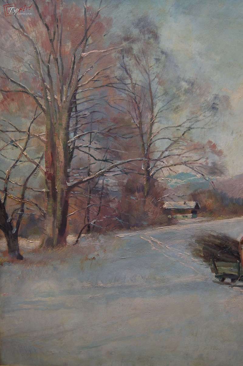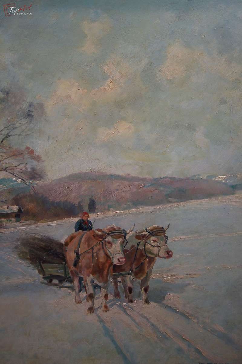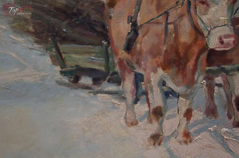 Bardzo duży autentyczny, niezwykle dekoracyjny, profesjonalnie namalowany obraz olejny na grubej sklejce, przedstawiający zimową scenę z życia "Zwózka drewna" . Jedno z lepszych dzieł tego autora. Autorem tej pracy jest Paul Johann Walch . Obraz malowany w technice pędzla, struktura nałożonej farby wyczuwalna pod palcami. Artysta na obrazie przedstawia typową dla swojej twórczości prace. Sygnowany prawy dół : Paul Johann Walch ( miejscowość nieczytelna, data najprawdopodobniej 1935 ). Obraz oprawiony jest w przepiękną, przestrzenną ramę z okresu powstania. Dzieło polecamy koneserom cennego i dobrego malarstwa. Portal notowań aukcyjnych Artprice odnotowuje 233 sprzedanych obrazów tego artysty. Stan zachowania bardzo dobry. Nie wymaga ingerencji, do powieszenia na ścianie.. Wymiary: całości z ramą 99 cm x 109 cm, obrazu 80 cm x 90 cm.