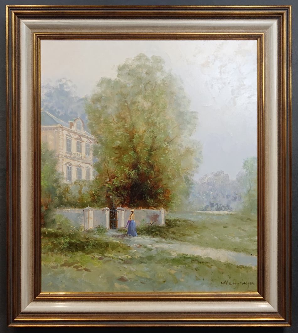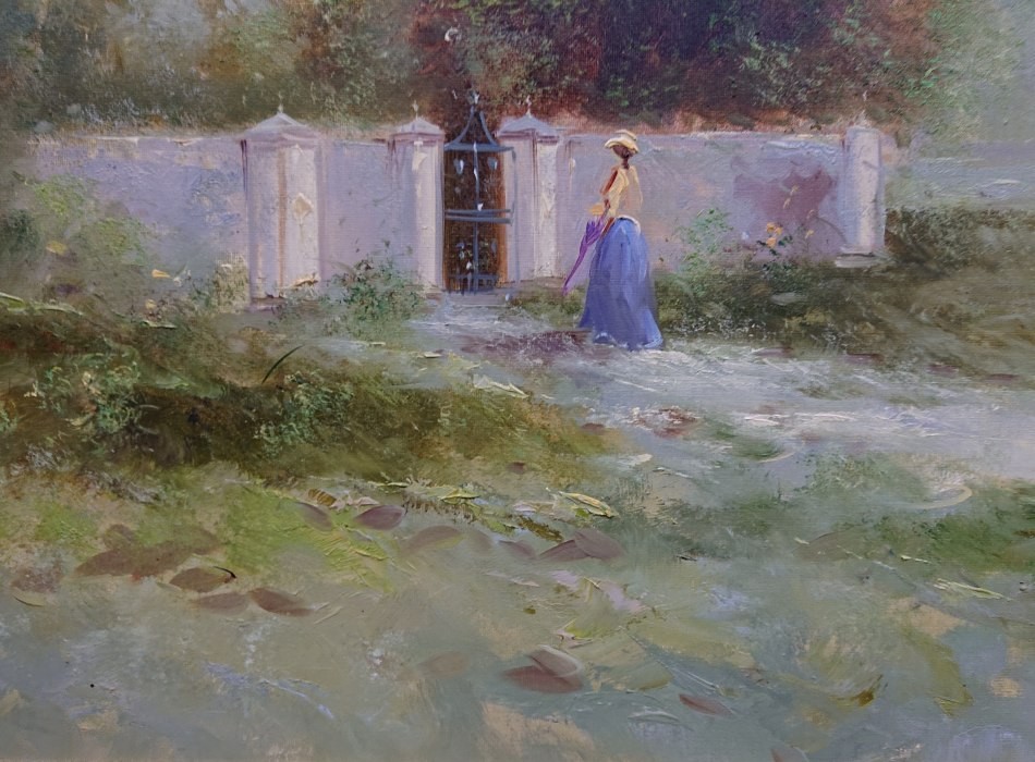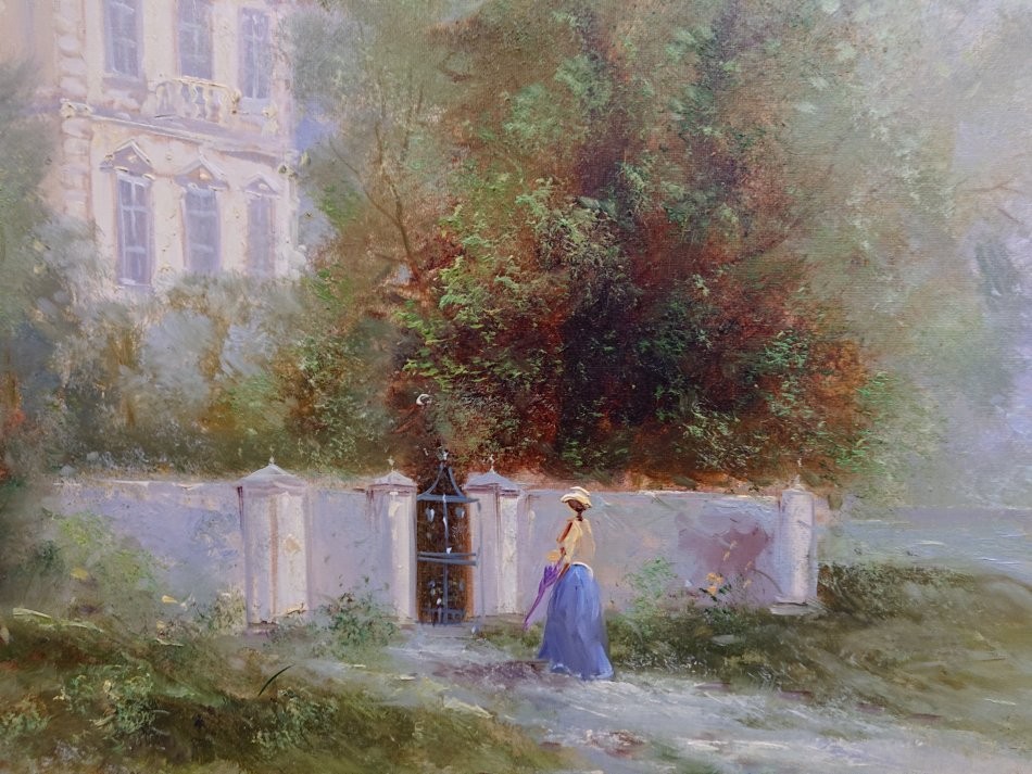Przedstawiamy niezwykłe dzieło Heinza Jurgena Menzingera, które łączy mistrzowski pejzaż z intrygującą sceną rodzajową. Obraz przenosi nas w upalne, letnie popołudnie. Piaszczysta droga, będąca osią kompozycji, prowadzi wzrok widza ku pięknej, jasnej willi o czerwonym dachu. Przed domem dostrzegamy drobną sylwetkę kobiety w jasnej sukni, niosącej złożoną parasolkę przeciwsłoneczną — postać zdaje się zmierzać w stronę domostwa, co nadaje dziełu tytułowy charakter wizyty lub powrotu. Najbardziej fascynującym elementem tła jest monumentalny, ciemny mur wyrastający tuż za budynkiem, który w połączeniu z błękitem nieba tworzy niesamowity kontrast i buduje poczucie bezpieczeństwa oraz luksusu prezentowanej posiadłości.