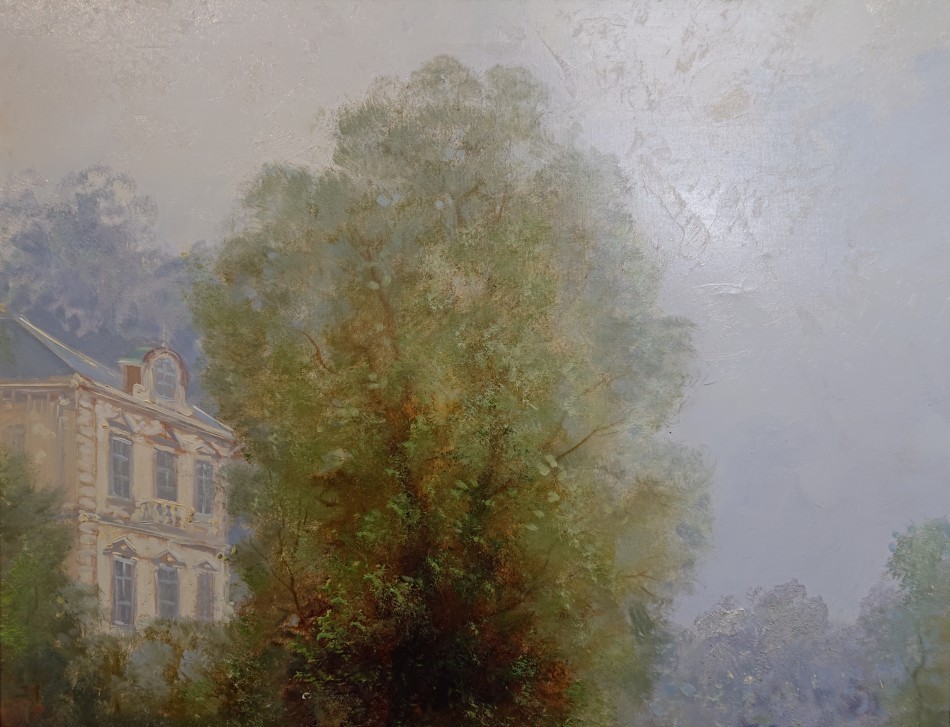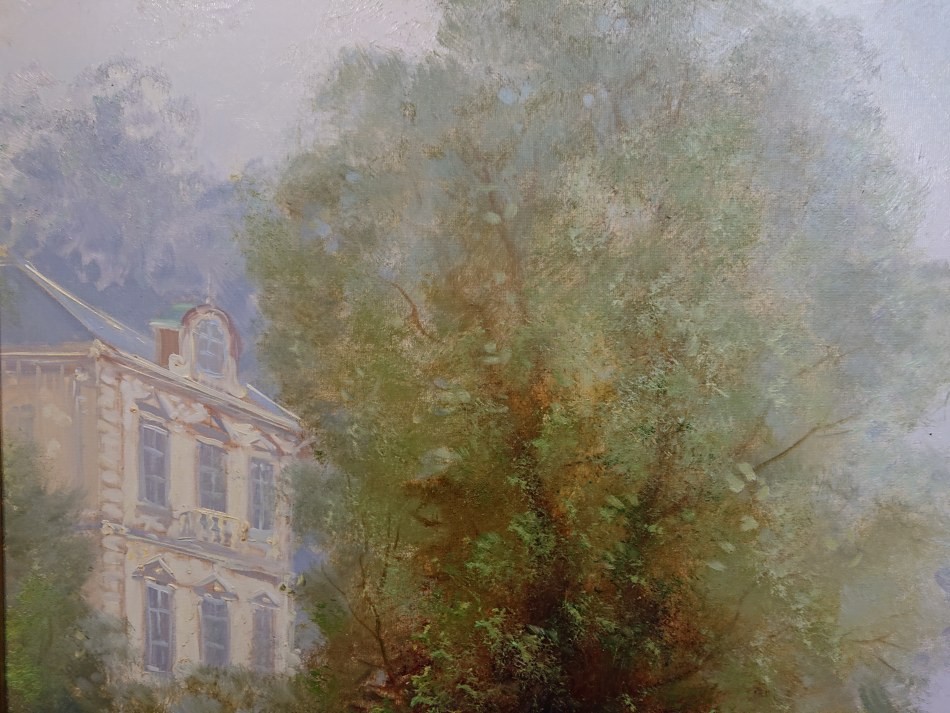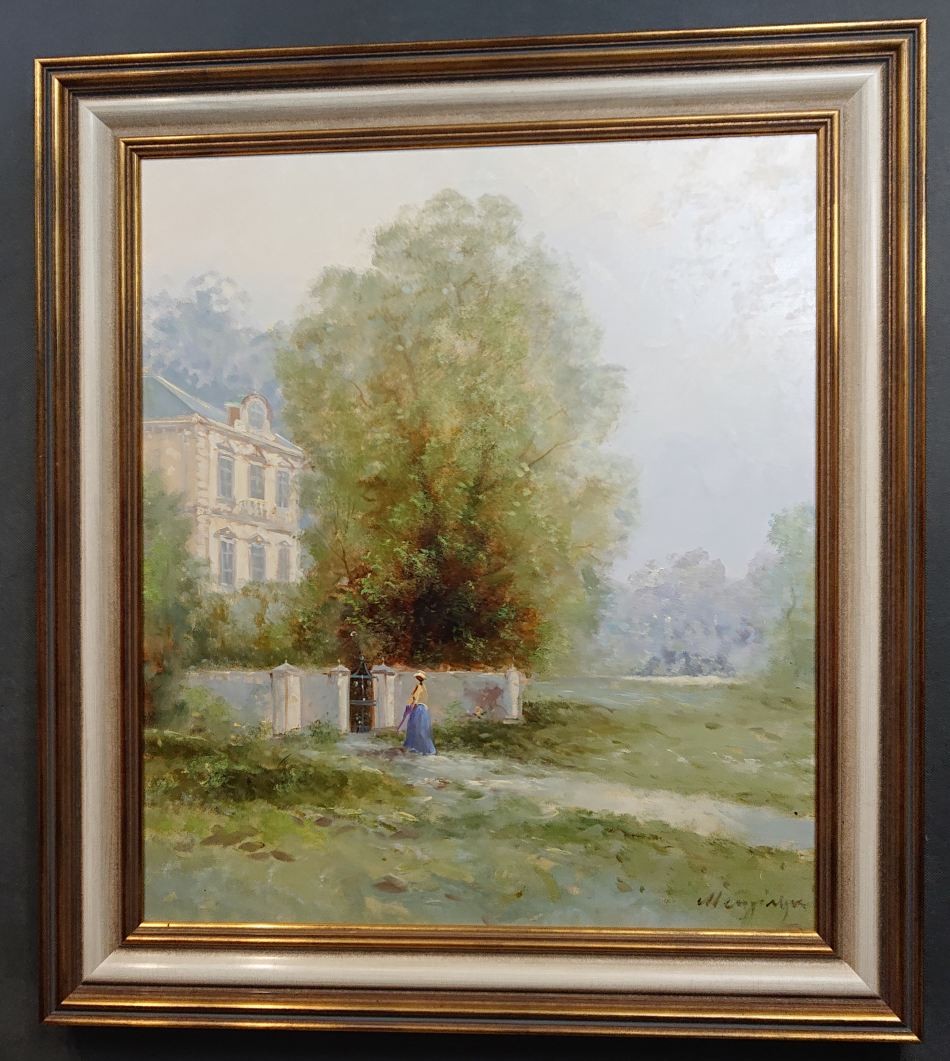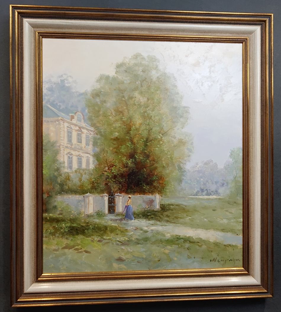 Kunszt Detalu i Architektury Menzinger, jako artysta z ogromnym doświadczeniem graficznym i akademickim (Royal Academy w Gandawie), z wielką precyzją oddał tu relację między naturą a architekturą. Gra światła na białych ścianach domu oraz faktura drogi usianej drobnymi kępami traw świadczą o najwyższej klasie warsztatowej. Obraz nie jest jedynie zapisem widoku, ale zaproszeniem do świata spokoju, elegancji i sielskiego życia elit lat 60. i 70. XX wieku.