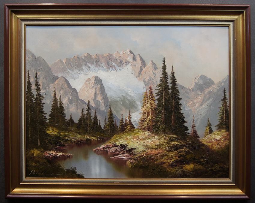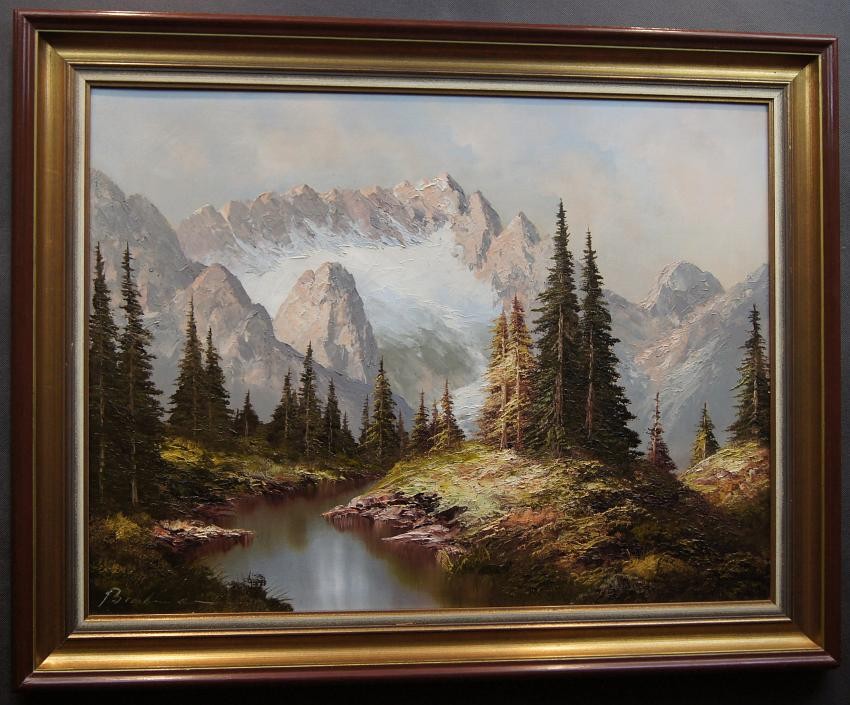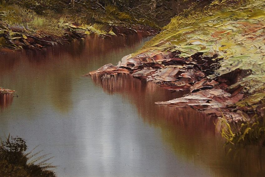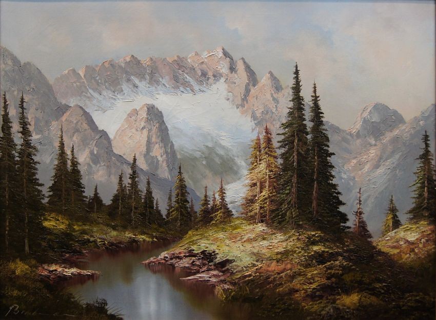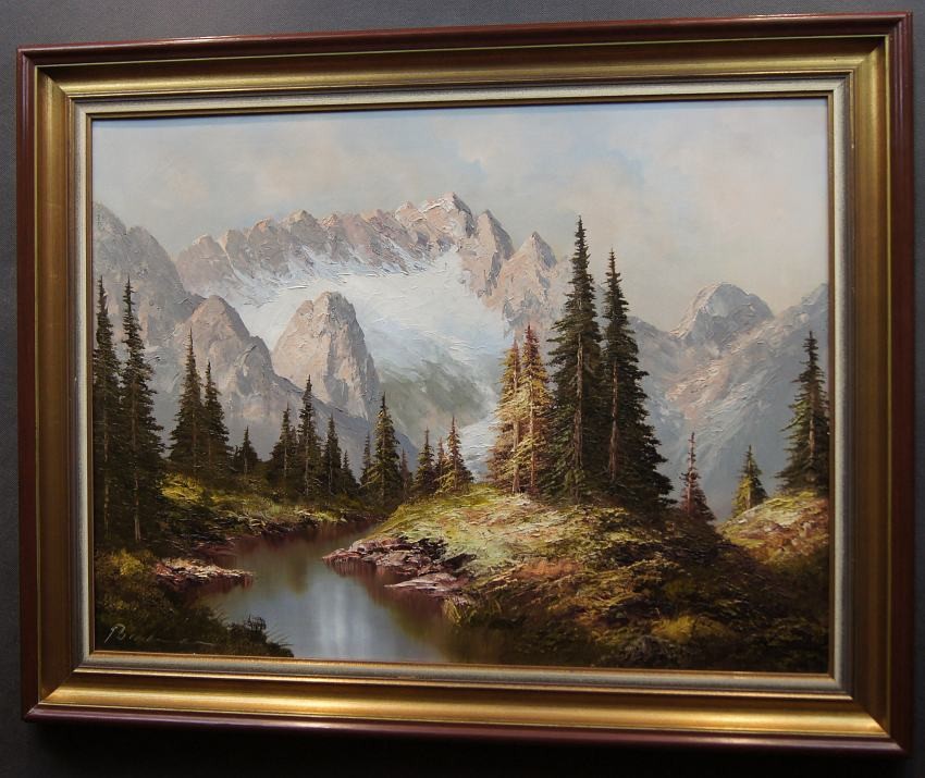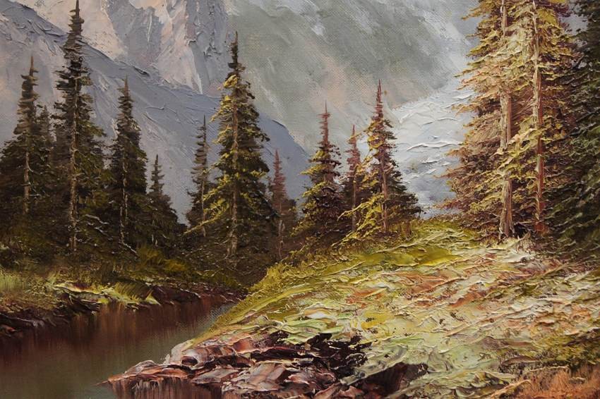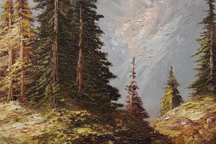 Dużych rozmiarów oryginalny obraz olejny, mistrzowsko namalowany na płótnie, przedstawiający rwący strumień spływający z wysokich partii gór i bogatą gęstą roślinnością. Wspaniała gra pastelowych kolorów. Autorem tej pracy jest niemiecki malarz Heinrich Bachmann.