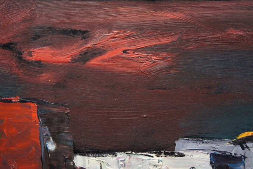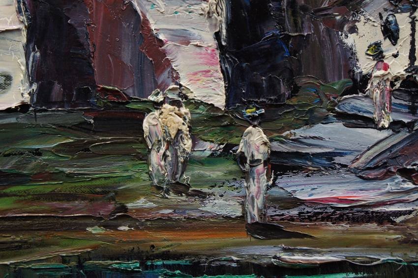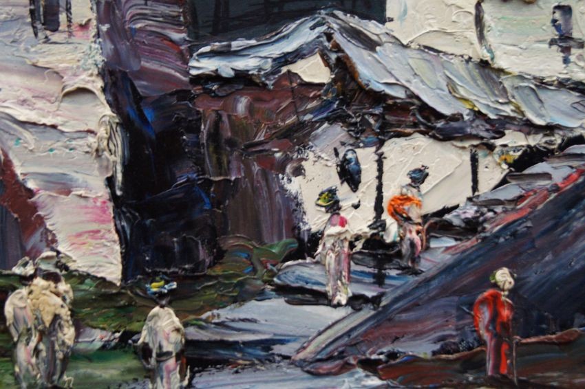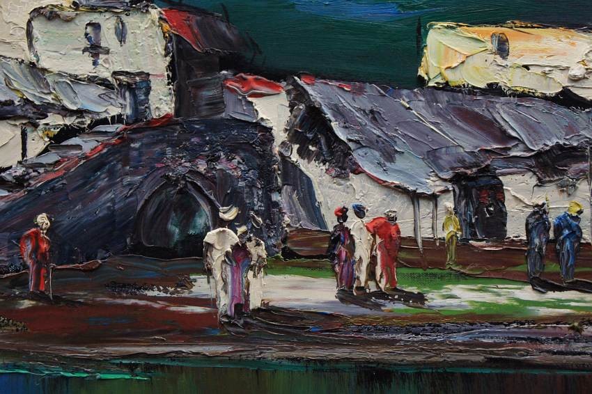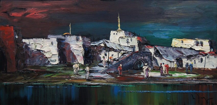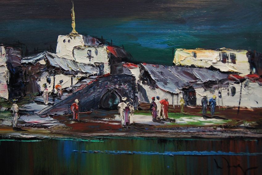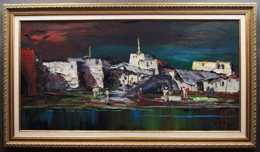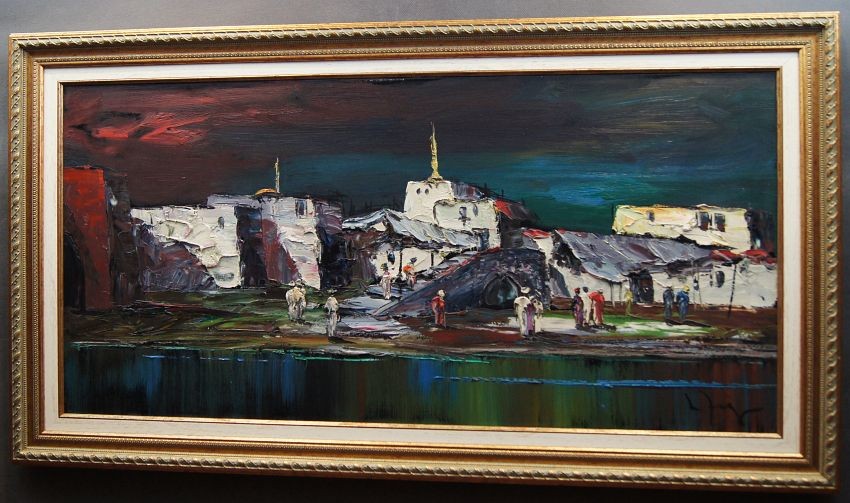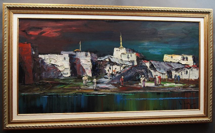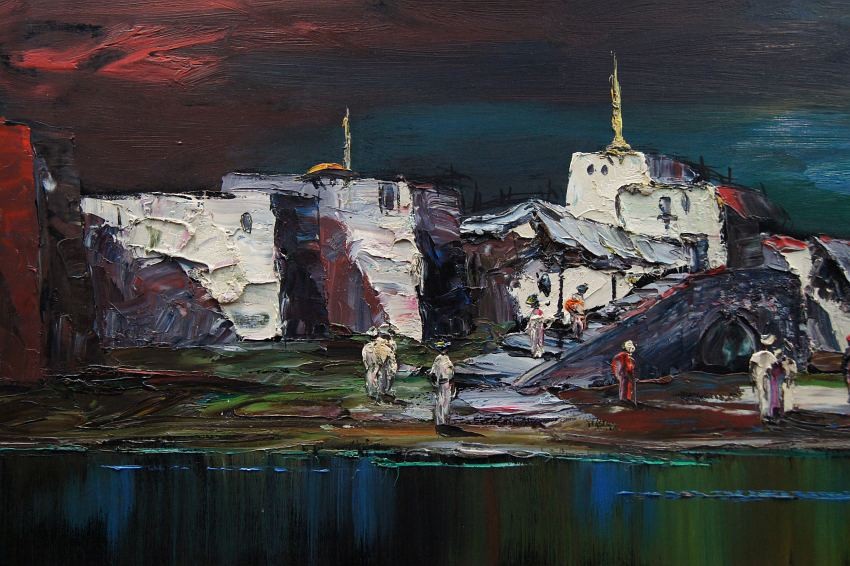Nietuzinkowy, pejzaż malowany w stylu nowoczesnego impresjonizmu. Nocny pejzaż z północno-zachodniej części Afryki. Artysta na obrazie przedstawia stolicę Maroko - Rabat namalowaną od strony oceanu atlantyckiego. Widzimy życie nocne, wśród tamtejszych zabudowań krzątają się liczne postacie.