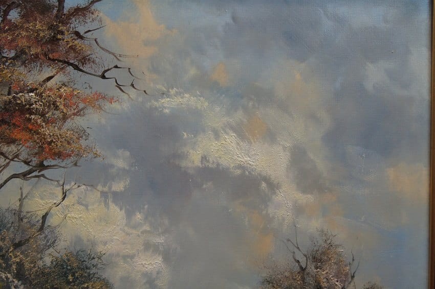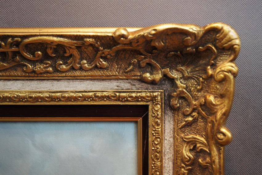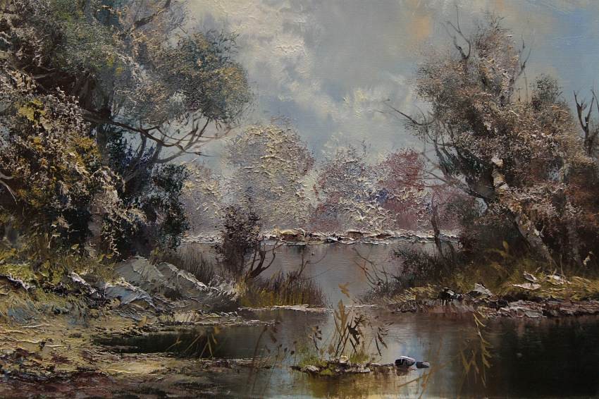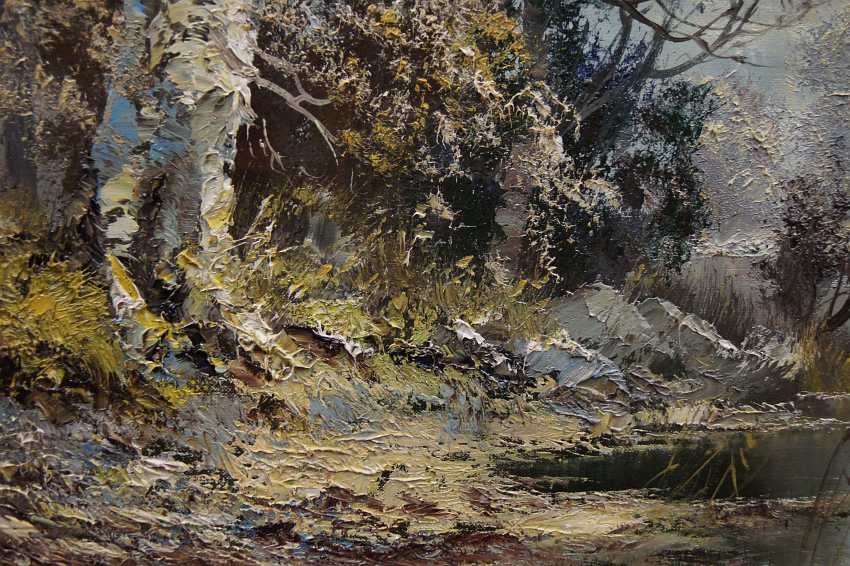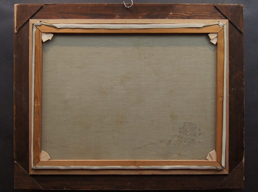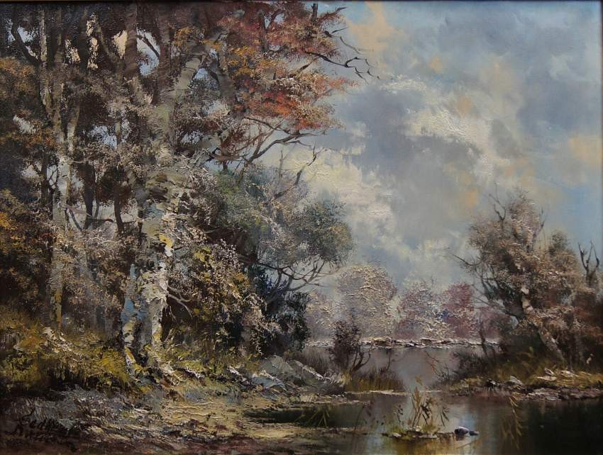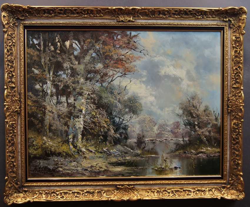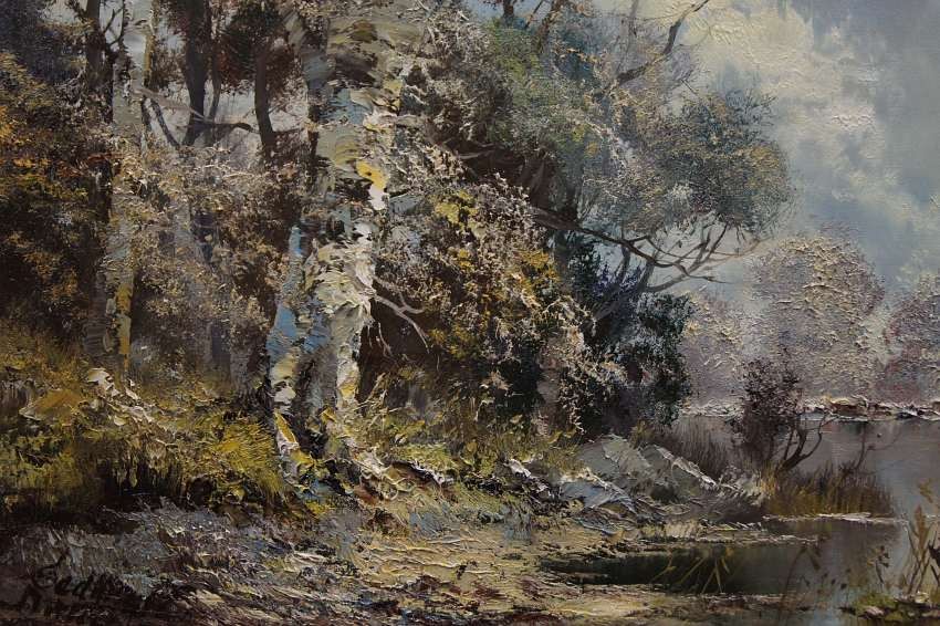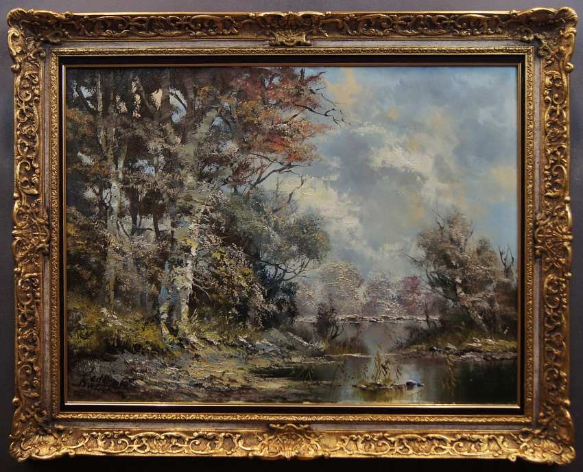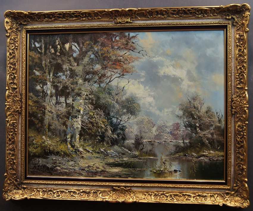Dekoracyjny obraz olejny, malowany farbami olejnymi na płótnie w technice pędzla. Na pracy uwieczniony jest niezwykle barwny pejzaż z akwenem wodnym. Sygnowany odręcznie przez artystę w lewym dolnym narożniku. Oprawiony w przestrzenną, dekoracyjną ramę pochodząca z okresu powstania pracy.