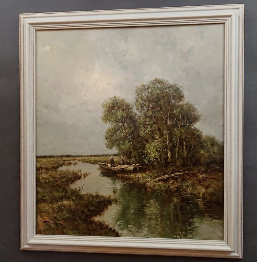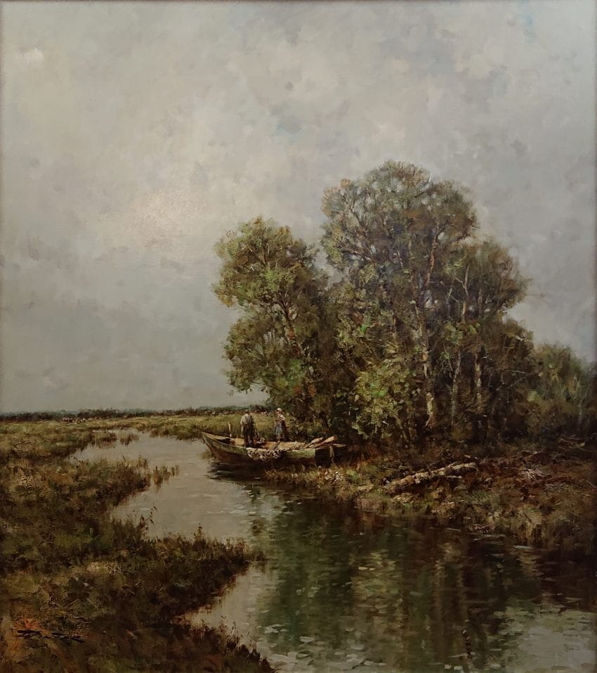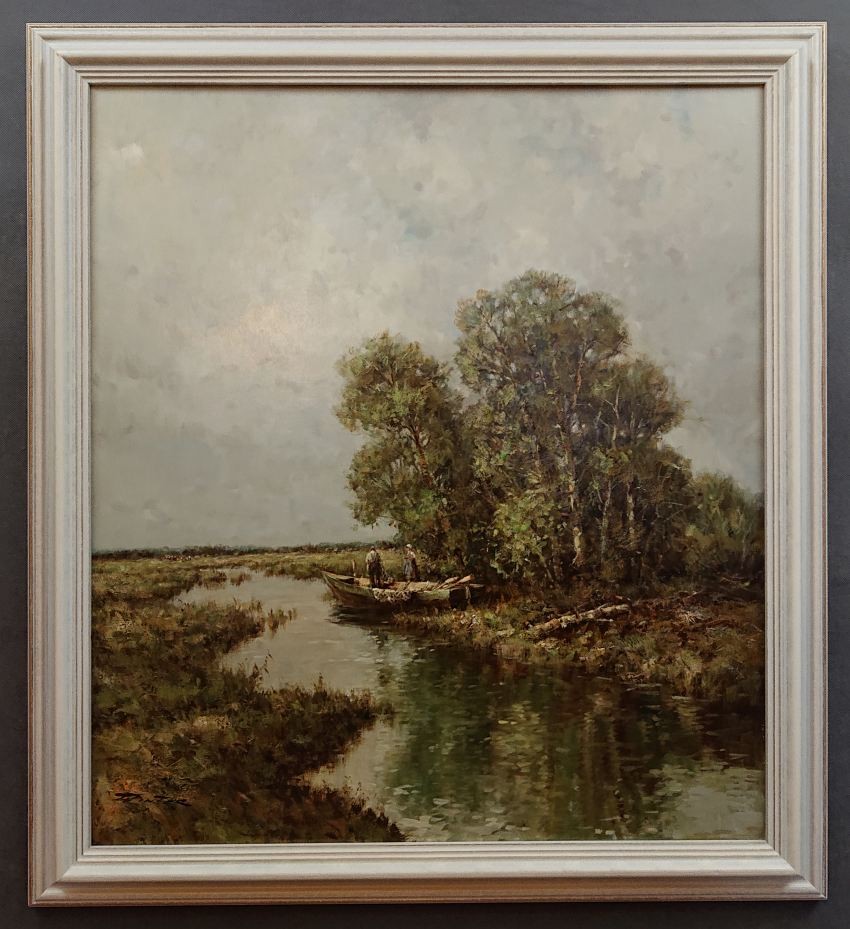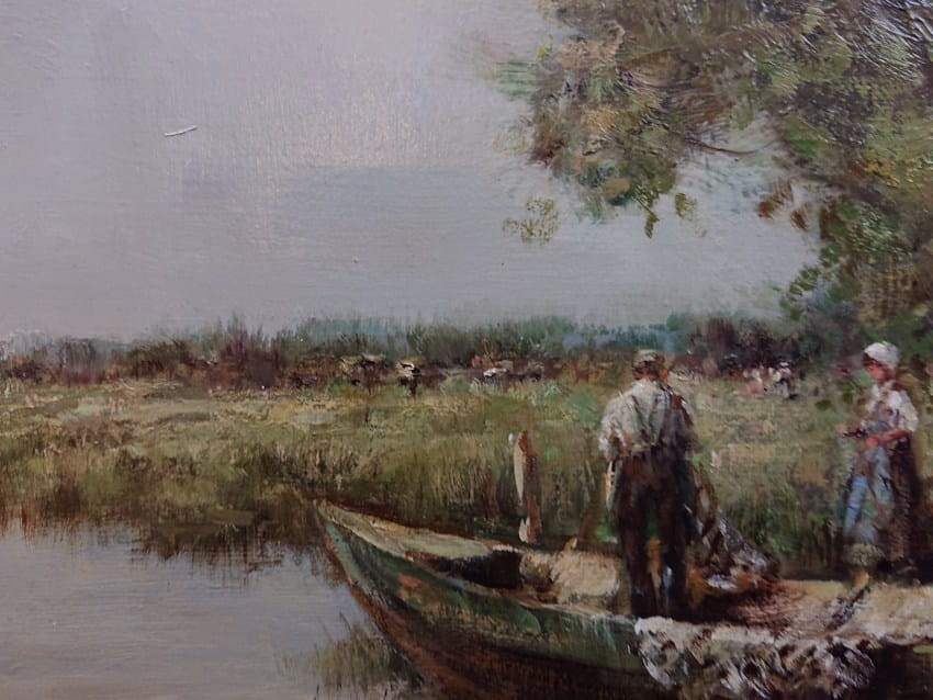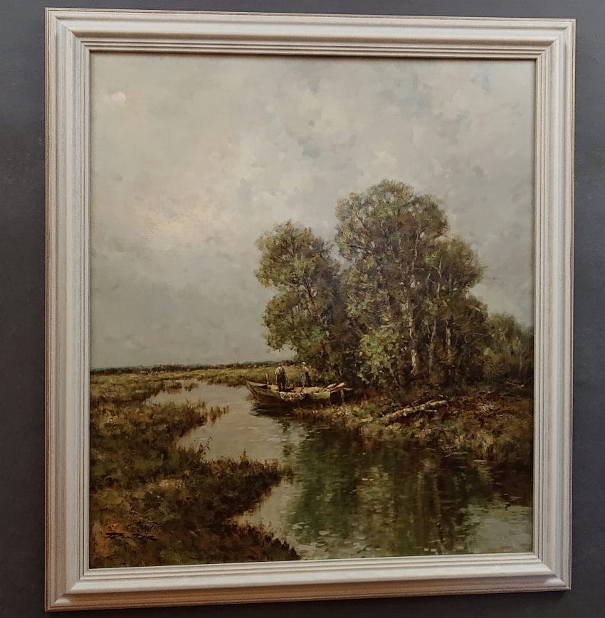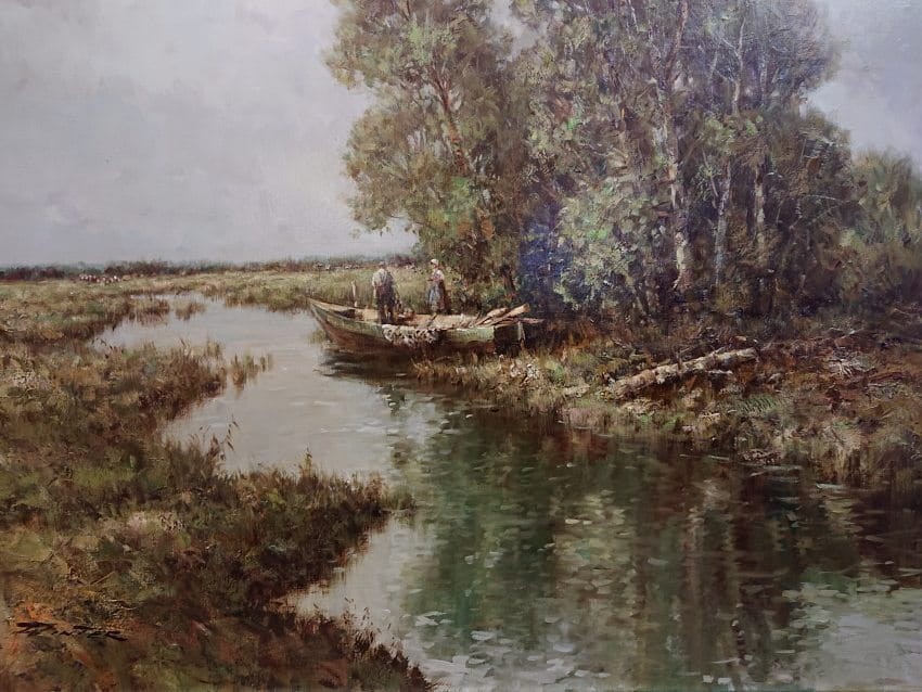 Obraz przedstawia scenerię wiejską z początku XX wieku. Plan krajobrazu z wrzosowiskami i rzeką wzbogacony łódką i dwoma postaciami. w oddali widoczne są liczne postacie podczas pracy na roli. To już kolejna doskonała, autentyczna praca stworzona z niezwykłym polotem, doskonale opanowująca grę między światłem a cieniem. Jest to duży obraz olejny na płótnie, naciągniętym na drewnianym krośnie, fazowanym, ruchomym z klinami. Autorem tej pracy jest niemiecki artysty Jürgen Winter. Obraz malowany w technice pędzla.