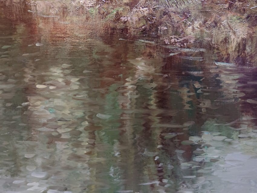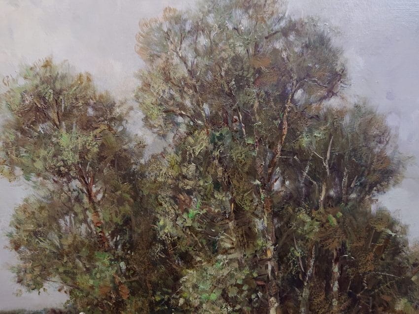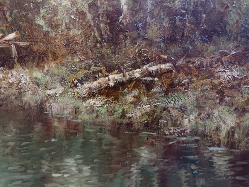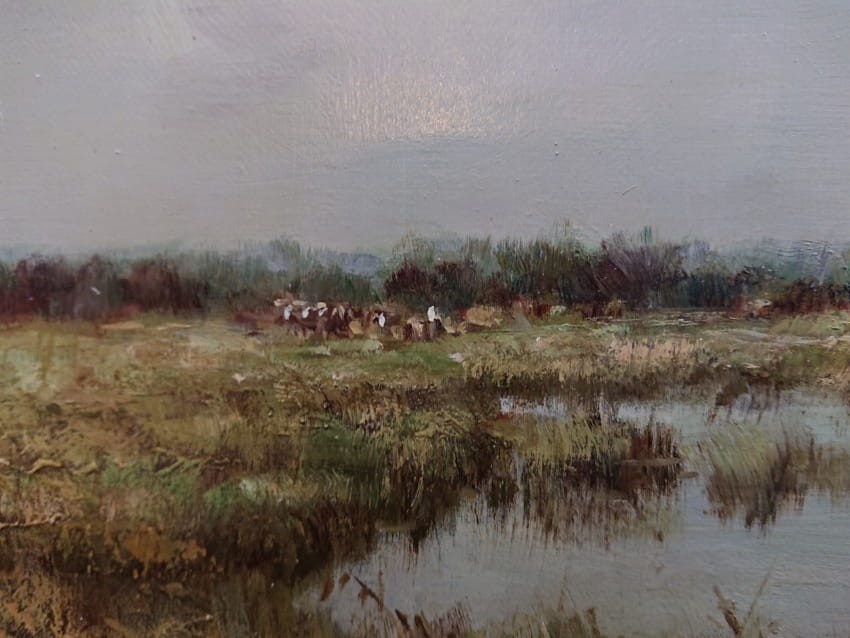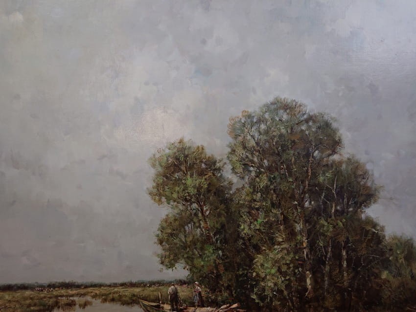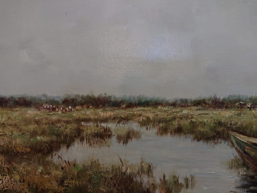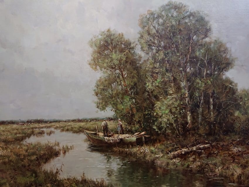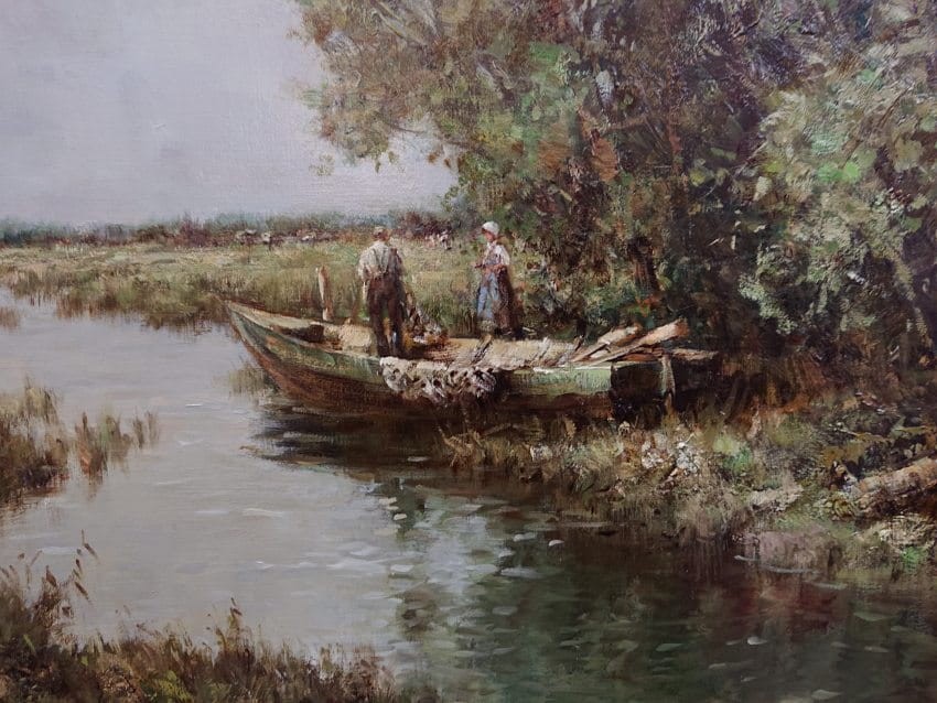 Obraz przedstawia scenerię wiejską z początku XX wieku. Plan krajobrazu z wrzosowiskami i rzeką wzbogacony łódką i dwoma postaciami. w oddali widoczne są liczne postacie podczas pracy na roli. To już kolejna doskonała, autentyczna praca stworzona z niezwykłym polotem, doskonale opanowująca grę między światłem a cieniem. Jest to duży obraz olejny na płótnie, naciągniętym na drewnianym krośnie, fazowanym, ruchomym z klinami. Autorem tej pracy jest niemiecki artysty Jürgen Winter. Obraz malowany w technice pędzla.