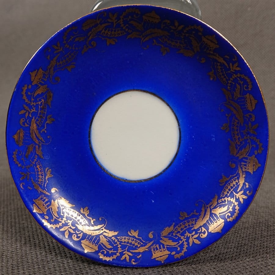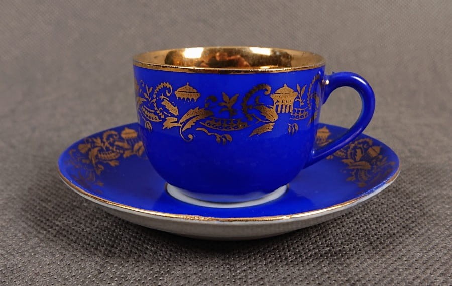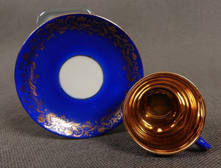 Filiżanka ma klasyczny, prosty kształt, lekko zwężający się ku dołowi, osadzony na niewielkiej, profilowanej podstawie. Górna część filiżanki jest ozdobiona szerokim, intensywnie chabrowym pasem, który u dołu jest falisty i obramowany cienką, złotą linią. Na tym chabrowym tle znajdują się misternie wykonane, złote ornamenty, przypominające pnącza lub stylizowane liście.