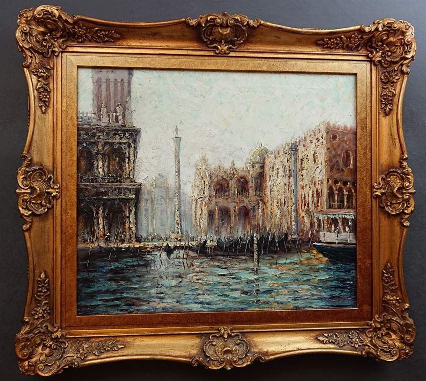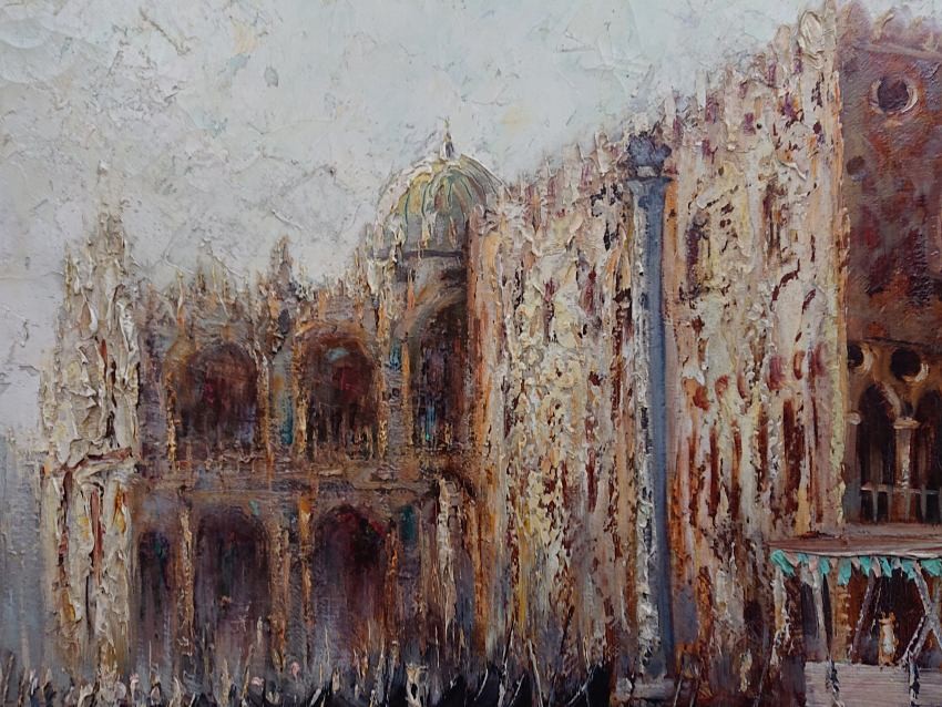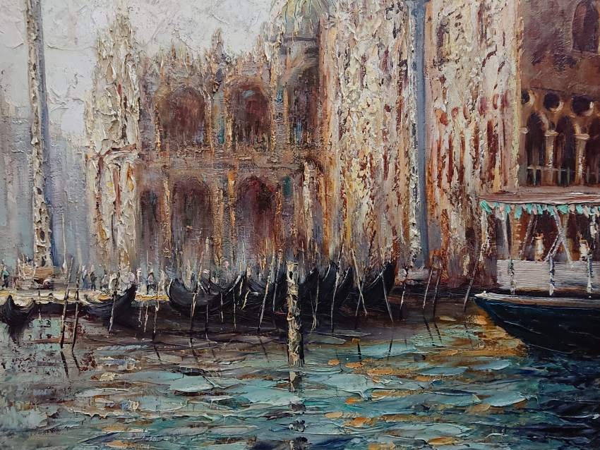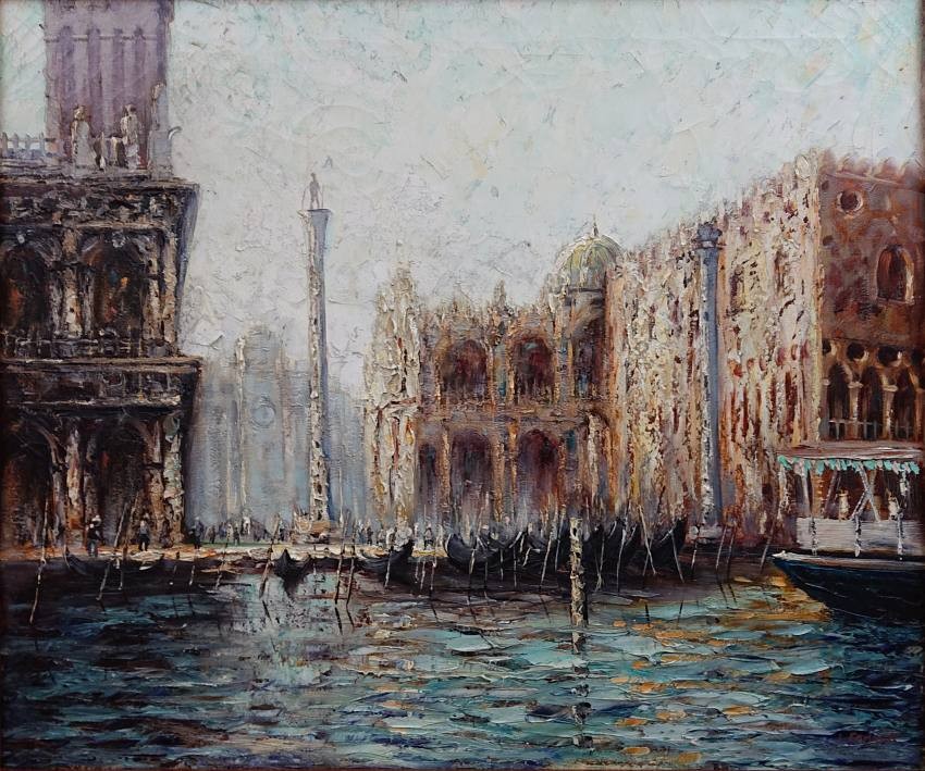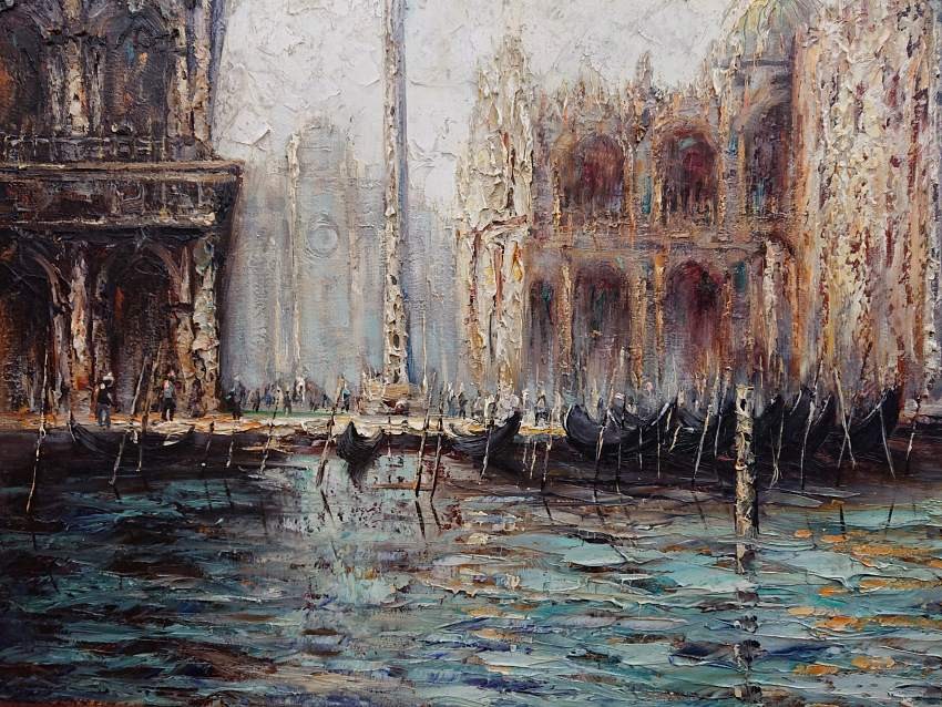 Wyjątkowy, impresjonistyczny obraz olejny przedstawiający scenerię z uroczej Wenecji. Na obrazie artysta uwiecznił Plac Świętego Marka. Autorem pracy jest niemiecki malarz Ludwig Sohler. Jest to jedno z piękniejszych dzieł tego malarza, niezwykle pożądanego na światowych aukcjach. Oryginalne dzieło malowane farbami olejnymi na płótnie w technice szpachli, struktura nałożonej farby bardzo wyraźnie wyczuwalna pod palcami. Praca niezwykle barwna, wirtuozerskie wręcz operowanie kolorami przez artystę.