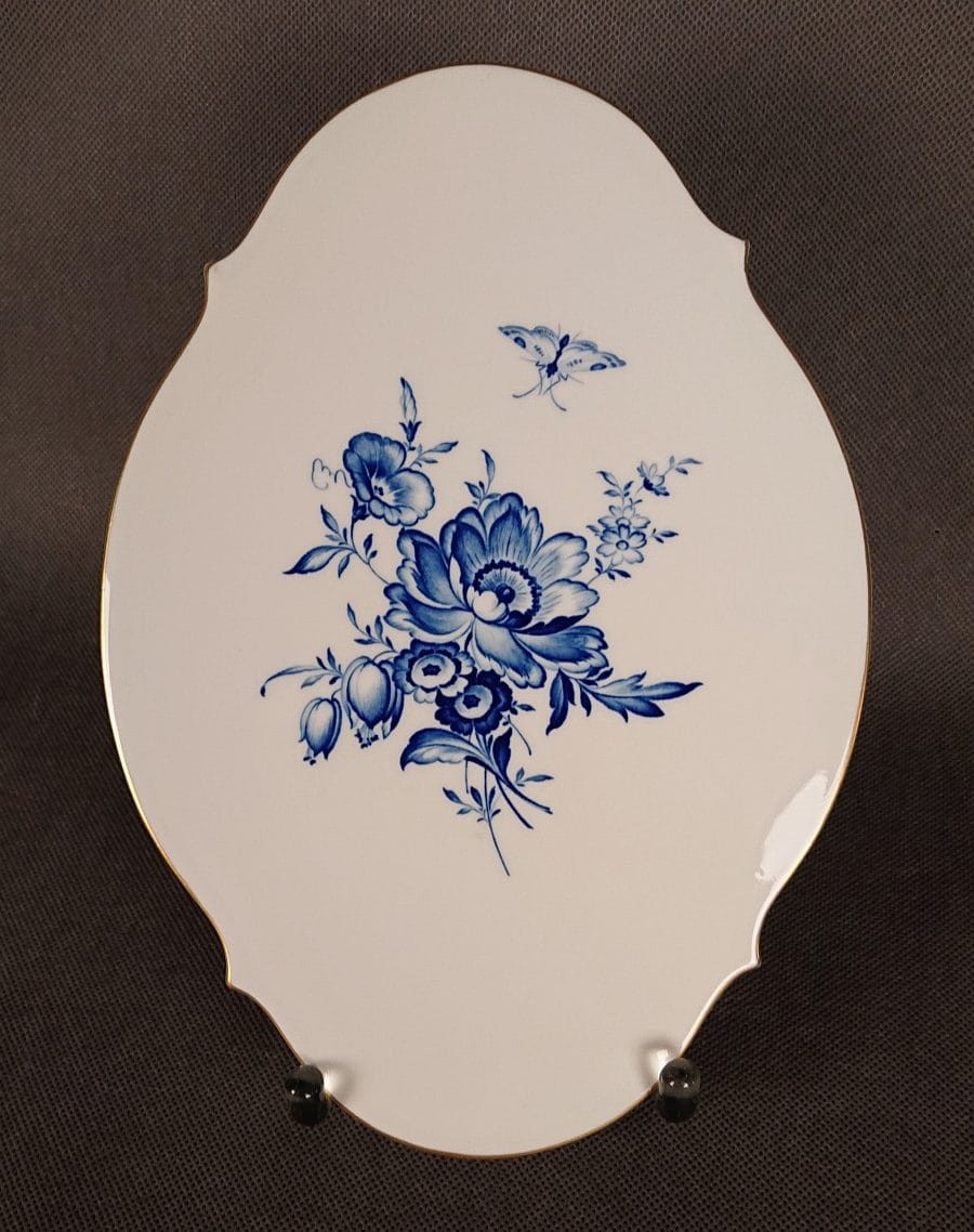 Porcelanowa plakietka do powieszenia na ścianie, wyprodukowana przez renomowaną manufakturę Miśnia (Meissen), prezentuje eleganckie i subtelne zdobienie w charakterystycznym stylu marki. Plakietka ma owalny kształt z delikatnymi, symetrycznymi wycięciami na dłuższych bokach, co nadaje jej dekoracyjny kontur.
