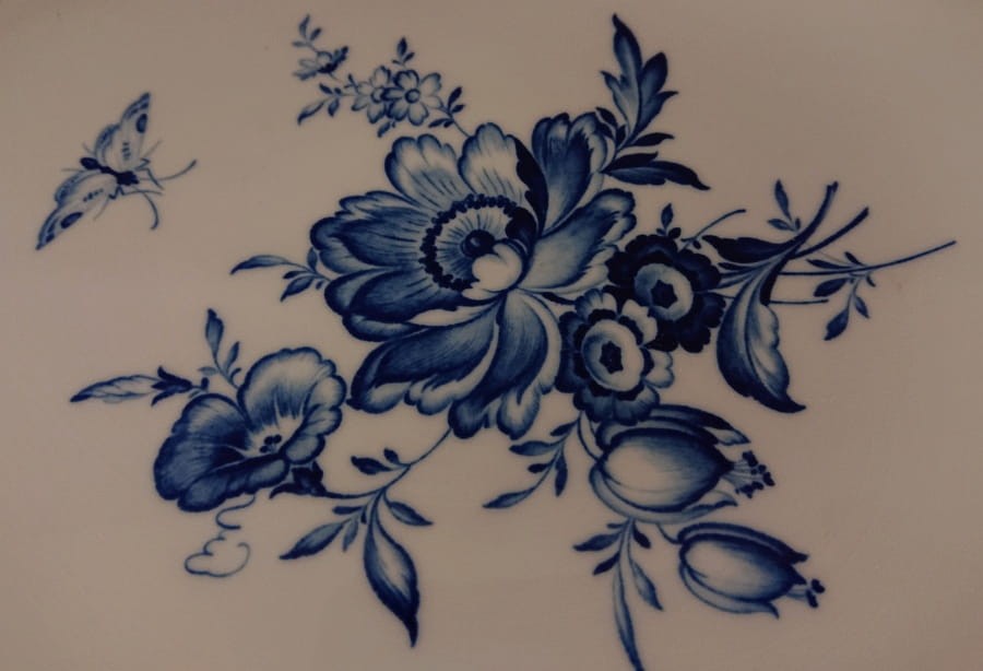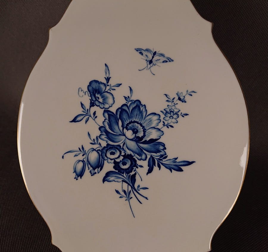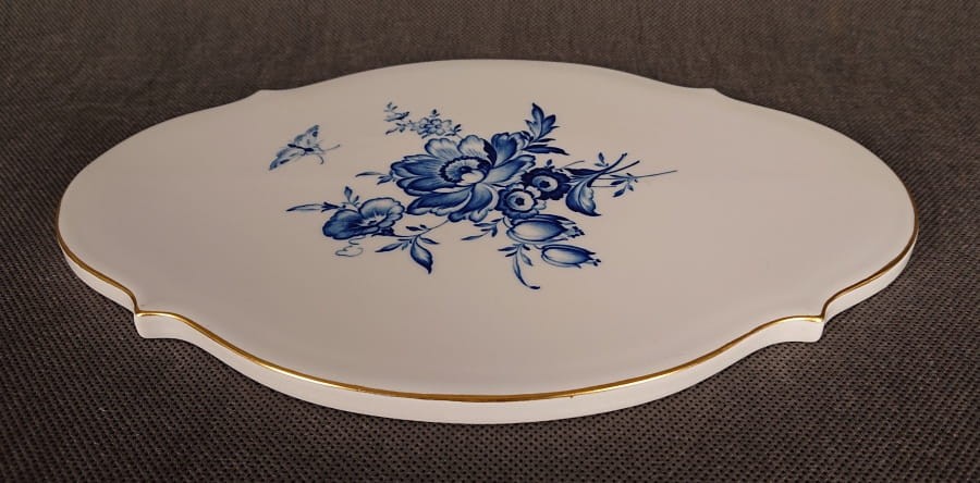 Wykonana z najwyższej jakości, śnieżnobiałej porcelany, plakietka stanowi idealne tło dla ręcznie malowanej dekoracji. Centralnym motywem jest bukiet stylizowanych, niebieskich kwiatów. Dominują duże, pełne kwiaty przypominające piwonie lub róże, otoczone mniejszymi pąkami i liśćmi o płynnych, organicznych kształtach. Malunek wykonany jest w odcieniach kobaltowego błękitu, z precyzyjnymi cienkimi liniami i delikatnym cieniowaniem, co nadaje kwiatom trójwymiarowości i subtelności.