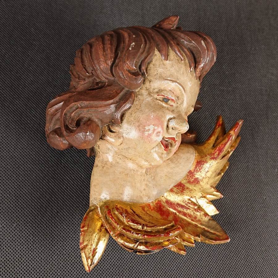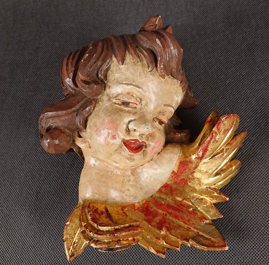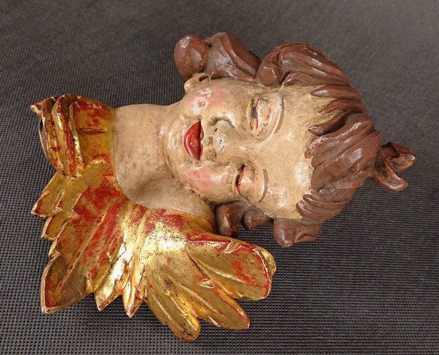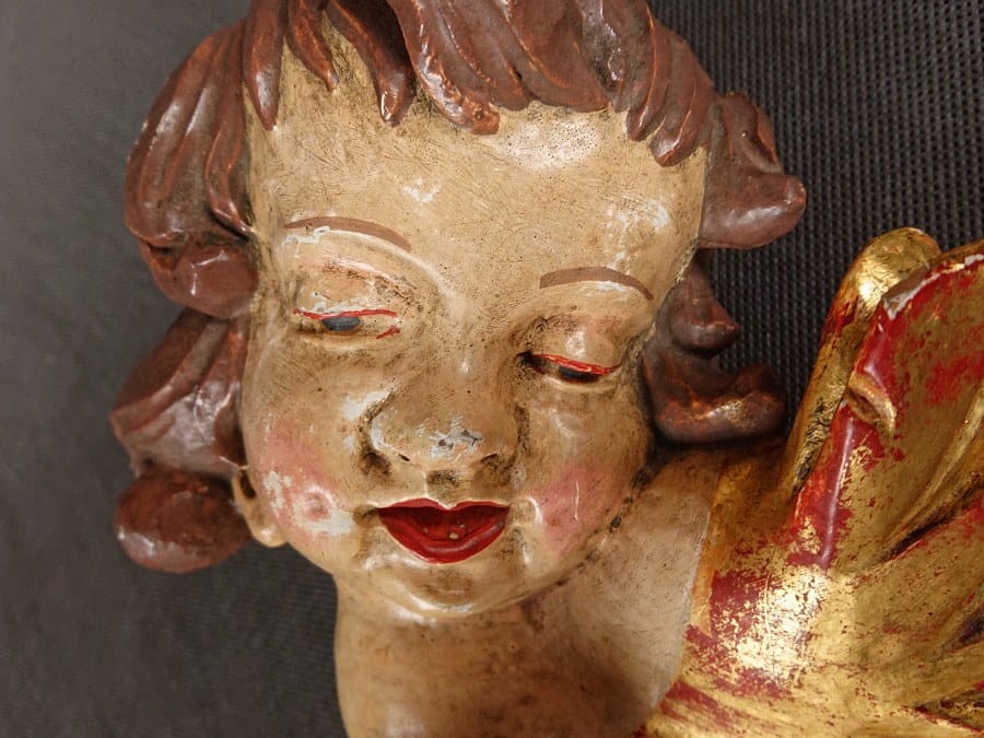 Polichromowana głowa amora ⭐ Ręcznie wykonana rzeźba XIX wiek
