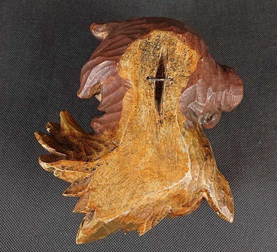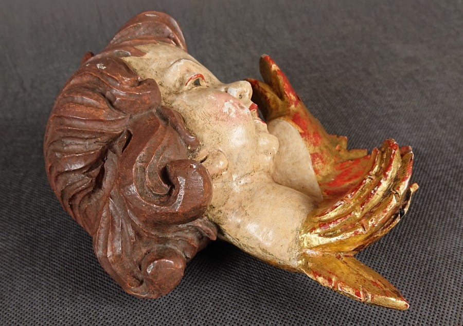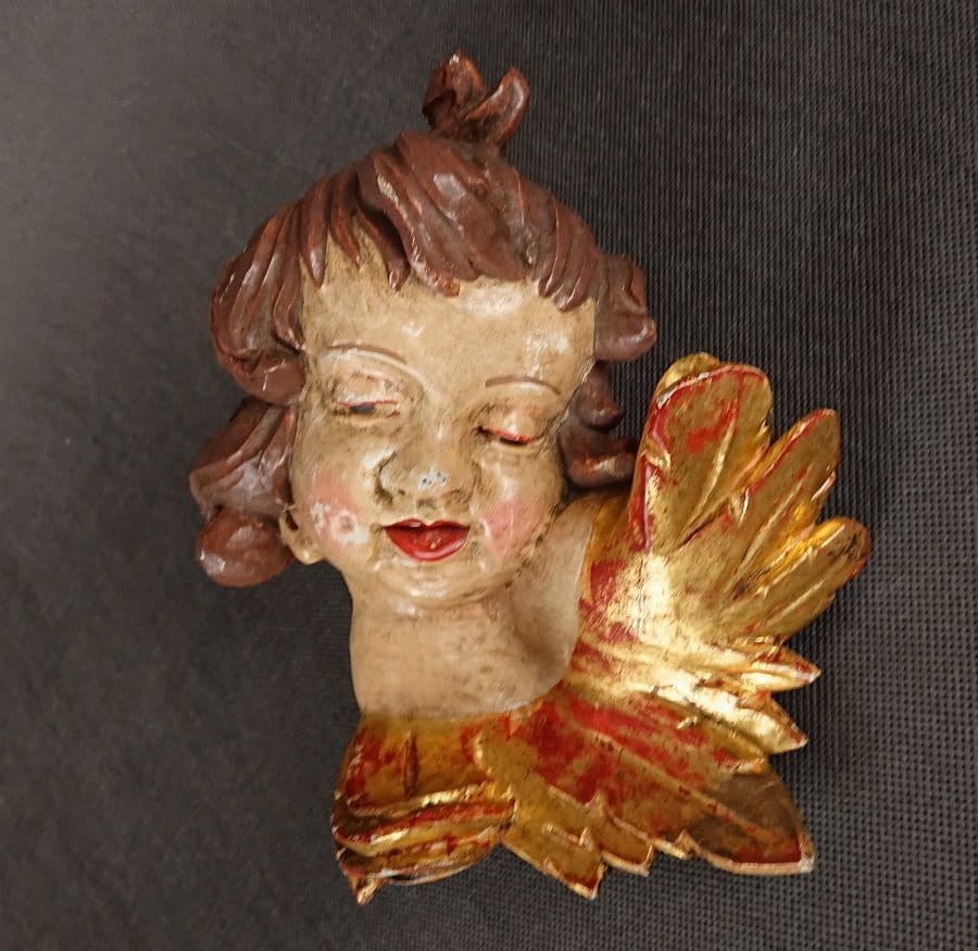 Polichromowana główka amora, powstała w XIX wieku, zachwyca subtelną ekspresją dziecięcej niewinności i elegancją barokowej dekoracyjności. wyrzeźbiona z litego drewna, z zachowaniem wyraźnego modelunku formy, rzeźba ukazuje pulchną twarz młodego aniołka – miękkie policzki o delikatnym rumieńcu, finezyjnie zaznaczone usta i owalne oczy zwrócone ku niebu. Artysta z precyzją odwzorował zwiewne loki, opadające miękkimi fale na kark, malując je głębokim, ciemnobrązowym pigmentem. Otaczające ramiona skrzydła pokrywają pozłacane pióra, ich powierzchnia miejscami wypolerowana przez czas i delikatnie spękana, co dodaje dziełu nostalgicznego charakteru i autentycznego uroku starości.