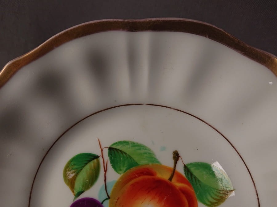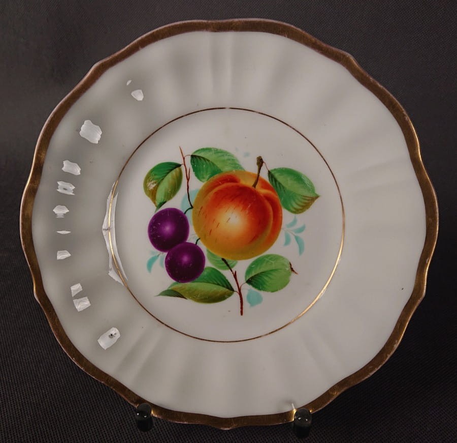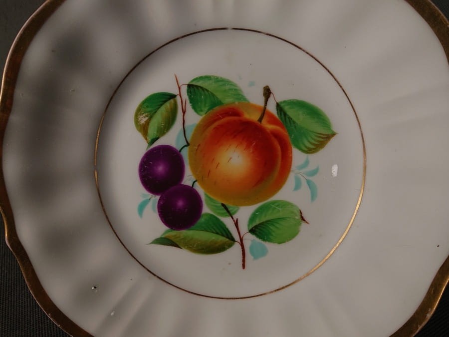 Piękność z Dolnego śląska. Na białym tle ręcznie wykonana dekoracja owocowa przedstawiająca jabłko i śliwki. Porcelanowy talerz wykonany z białej porcelany w XIX wieku Niezwykle wyjątkowa forma i zdobnictwo to wielki atuty tego wyjątkowego porcelanowego przedmiotu. Przedmiot idealny do kolekcji.