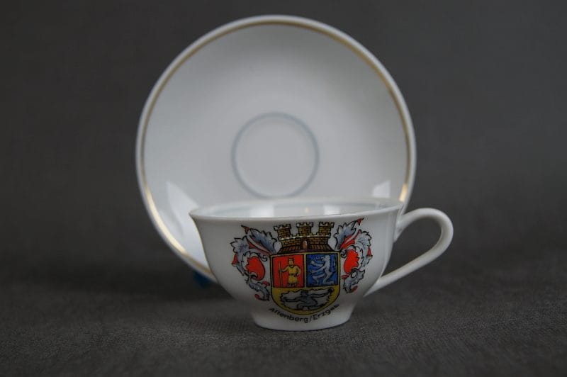 Porcelanowa unikatowa filiżanka ze spodkiem pochodząca z lat 70. Wykonana z porcelany w kolorze białym, herb niemieckiej miejscowości Altenberg im Erzgebirge, który jest umiejscowiony w centralnym miejscu na brzuścu, ręcznie malowany.