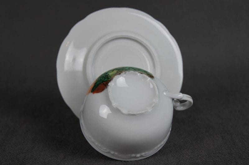 Porcelanowa filiżanka ze spodkiem pochodząca z lat 30. Wykonana z porcelany w kolorze białym, wizerunek zamku Hohstein w saksonii, który jest umiejscowiony w centralnym miejscu na brzuścu filiżanki. Dodatkowo filiżanka i spodek ozdobione delikatnymi złoceniami.