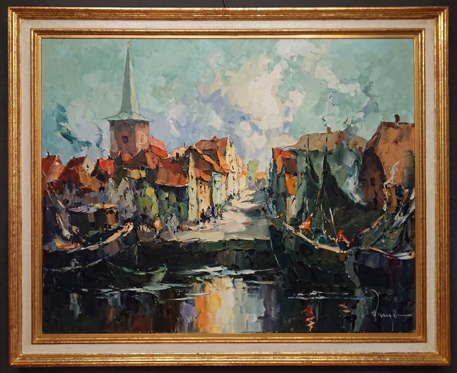 Tematyka: Przedstawia kanał lub port w starym europejskim mieście. Po lewej stronie dominuje charakterystyczna wieża kościoła z wysoką, smukłą iglicą. Po obu stronach nabrzeża widzimy zwartą zabudowę kamienic o dachach w kolorze palonej cegły.