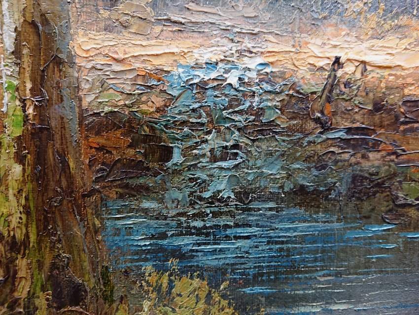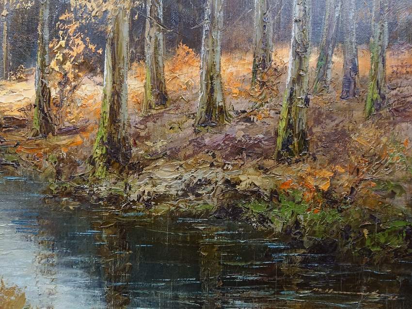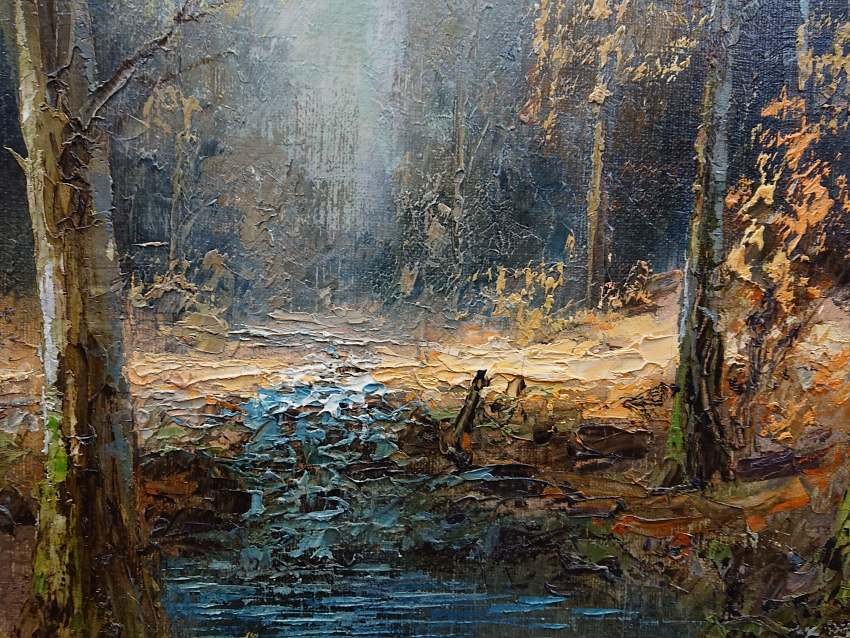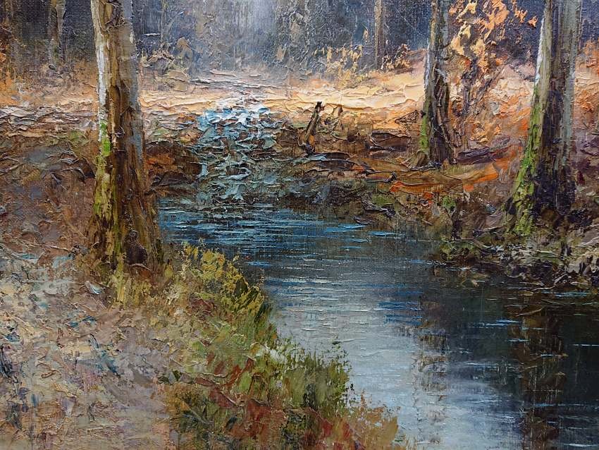 Autor na tym obrazie prezentuje pejzaż lasu z płynący przez niego potokiem. Cała sceneria przedstawiona p słoneczny letni dzień. Mistrzowsko odzwierciedlona gra światła i cienia. Impresjonistyczne dzieło sztuki w ofercie naszego sklepu. Obraz znanego niemieckiego impresjonisty. Namalowany został na płótnie naciągniętym na drewniane krosno z klinami. Tworzony śmiałymi pociągnięciami szpachli malarskiej, z niezwykłą precyzją i dbałością o wszystkie szczegóły. Praca niezwykle barwna, przedstawiająca bardzo duże walory artystyczne i dekoracyjne.