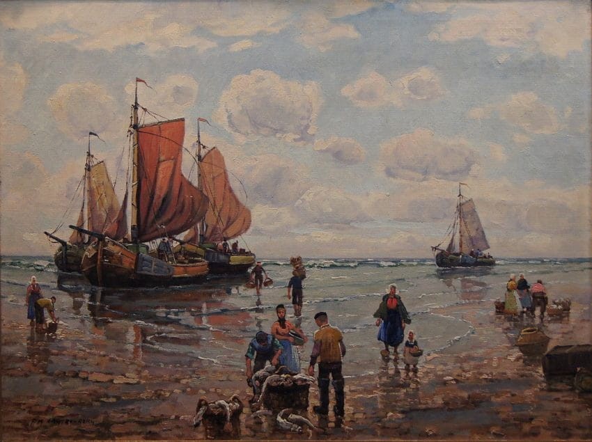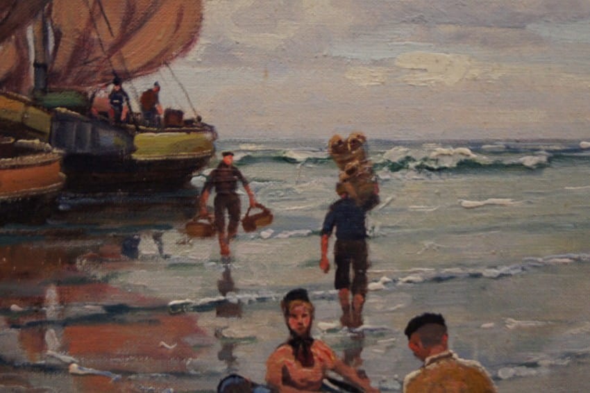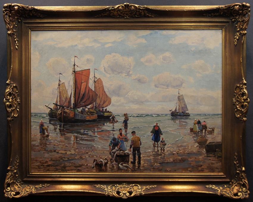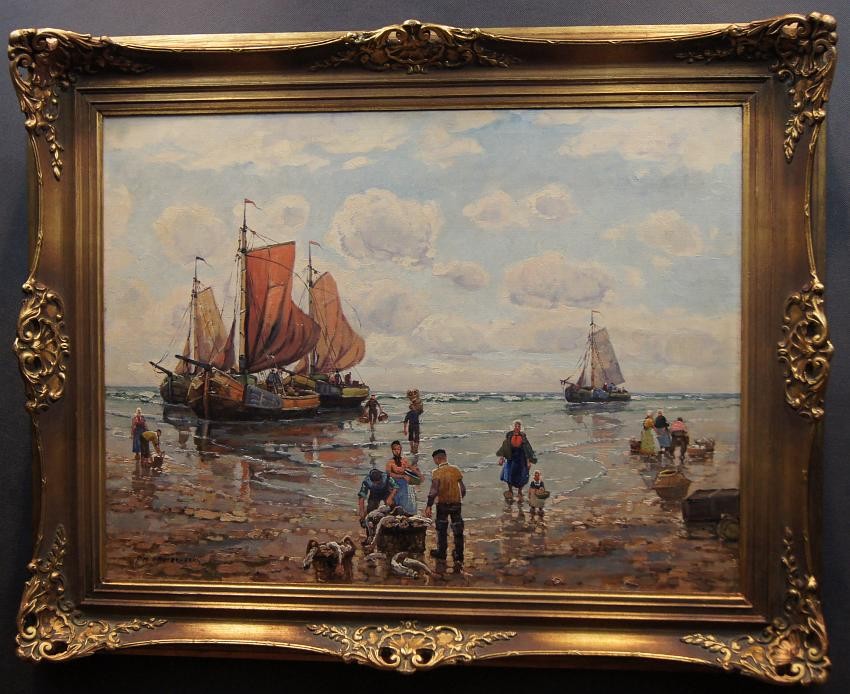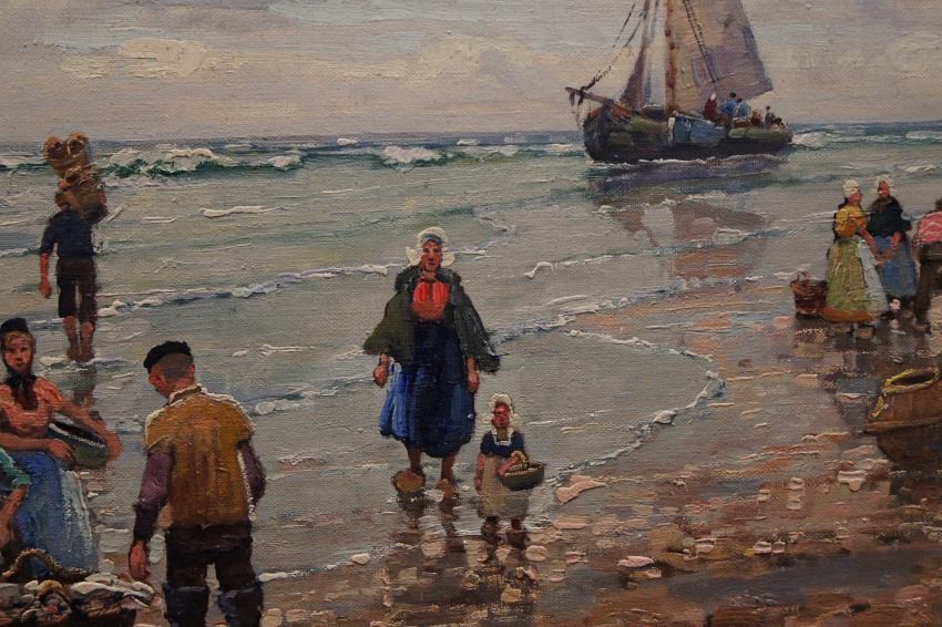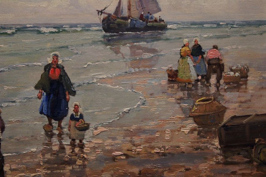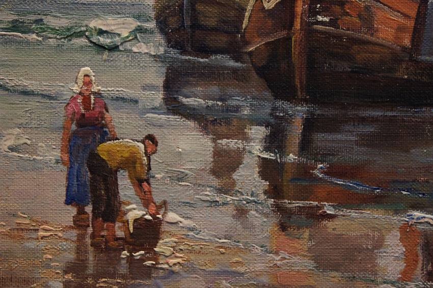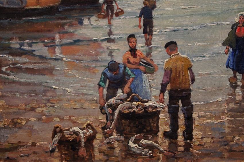 Oryginalny, niezwykle widowiskowy obraz olejny na płótnie znanego i cenionego aukcyjnego artysty. Technika malarska: pędzel. Sygnowany lewy dół: F. M.Richter -Reich. Na obrazie artysta uwiecznił scenę, na której pokazane są całe rodziny czekające na powrót mężczyzn z połowu.