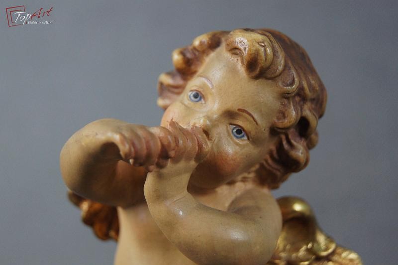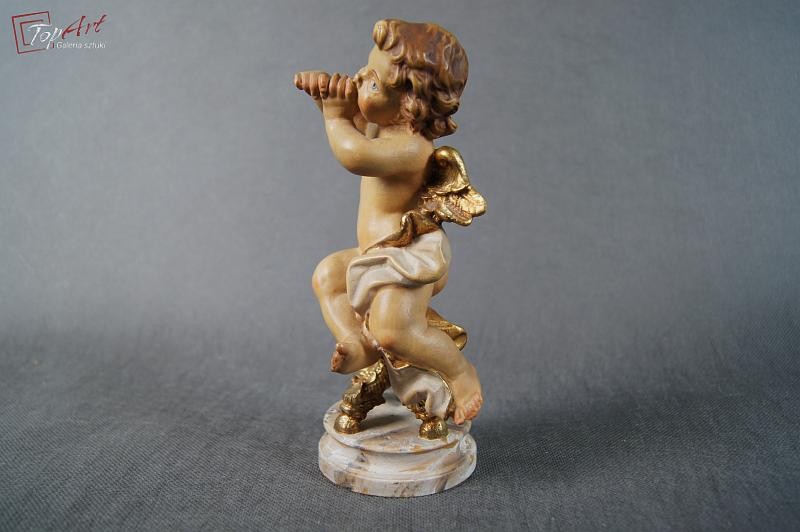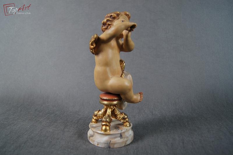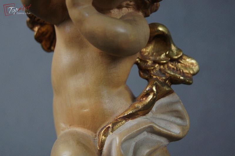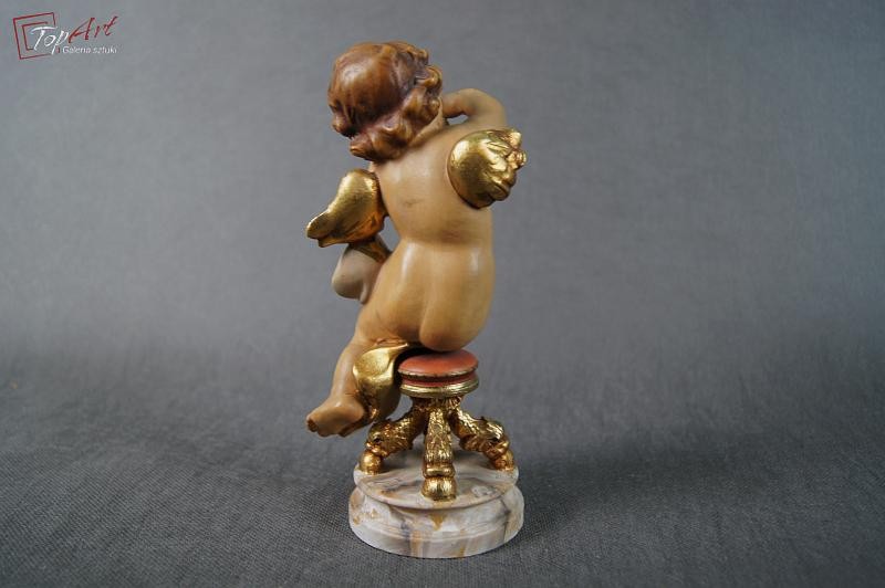 Prześliczny siedzący amorek. Przedmiot ręcznie wyrzeźbiony w drewnie. Pochodzi z Włoch. Wykonany w latach 70 - 80 XX wieku.Wykonany w polichromii złocony. Stan zachowania - bardzo dobry. Wymiary: wysokość 20 cm, średnica podstawy 7,5 cm.
