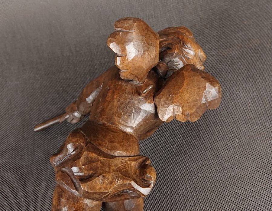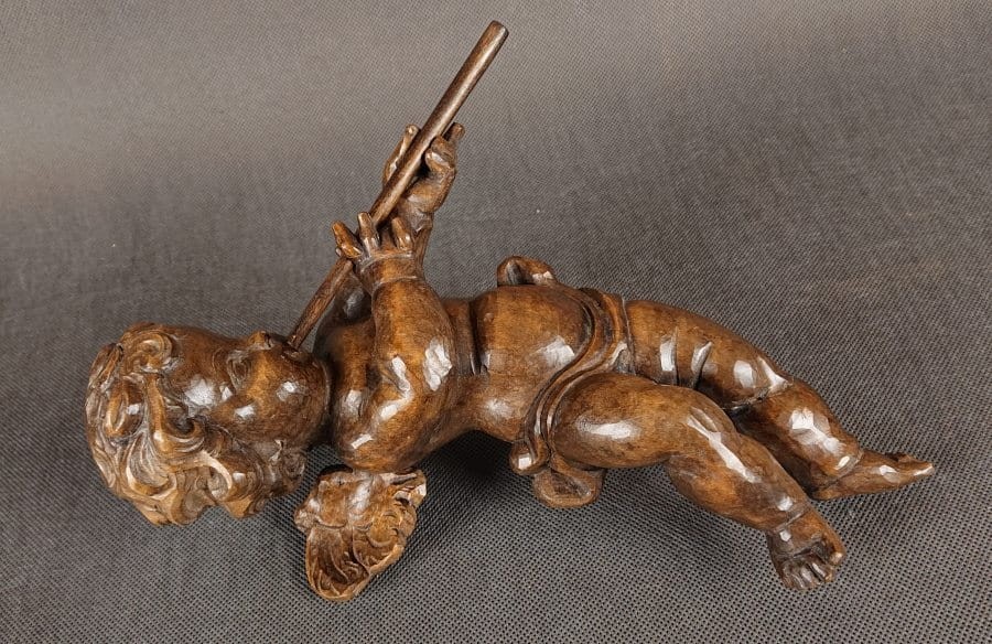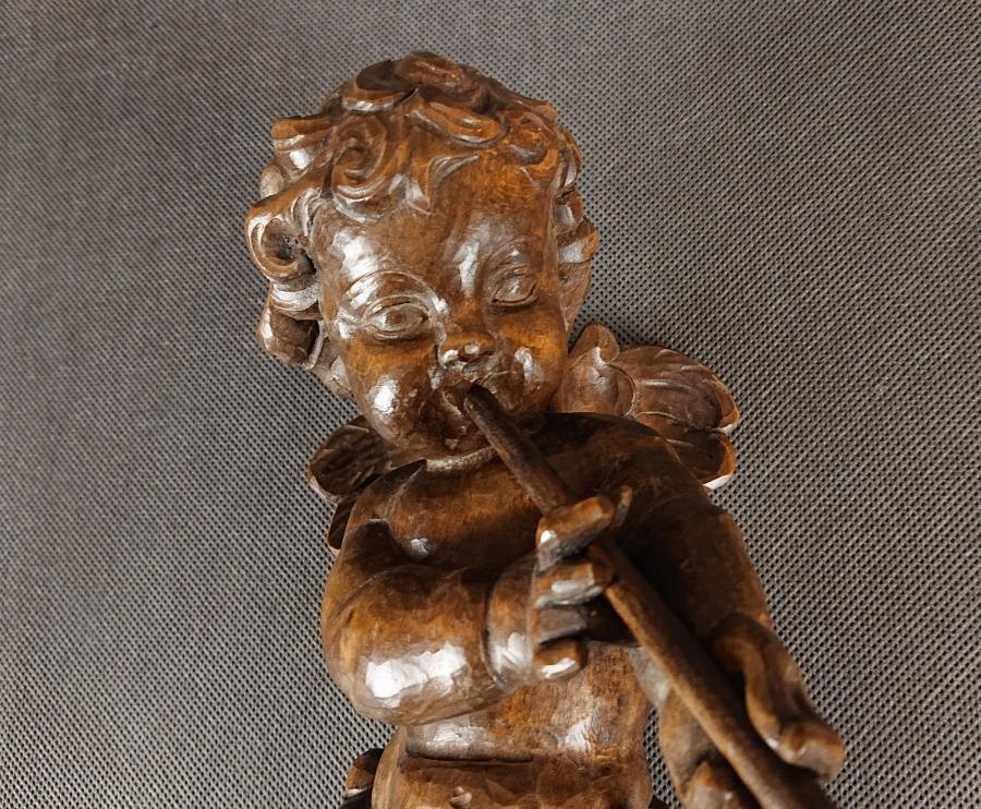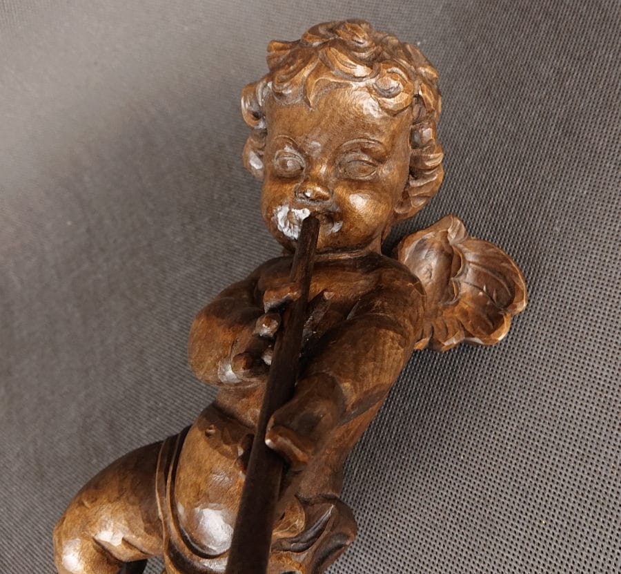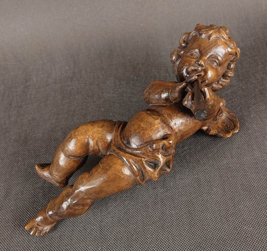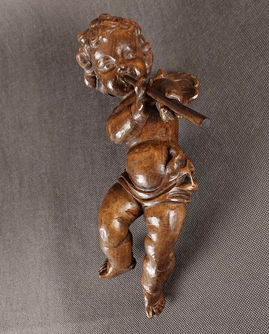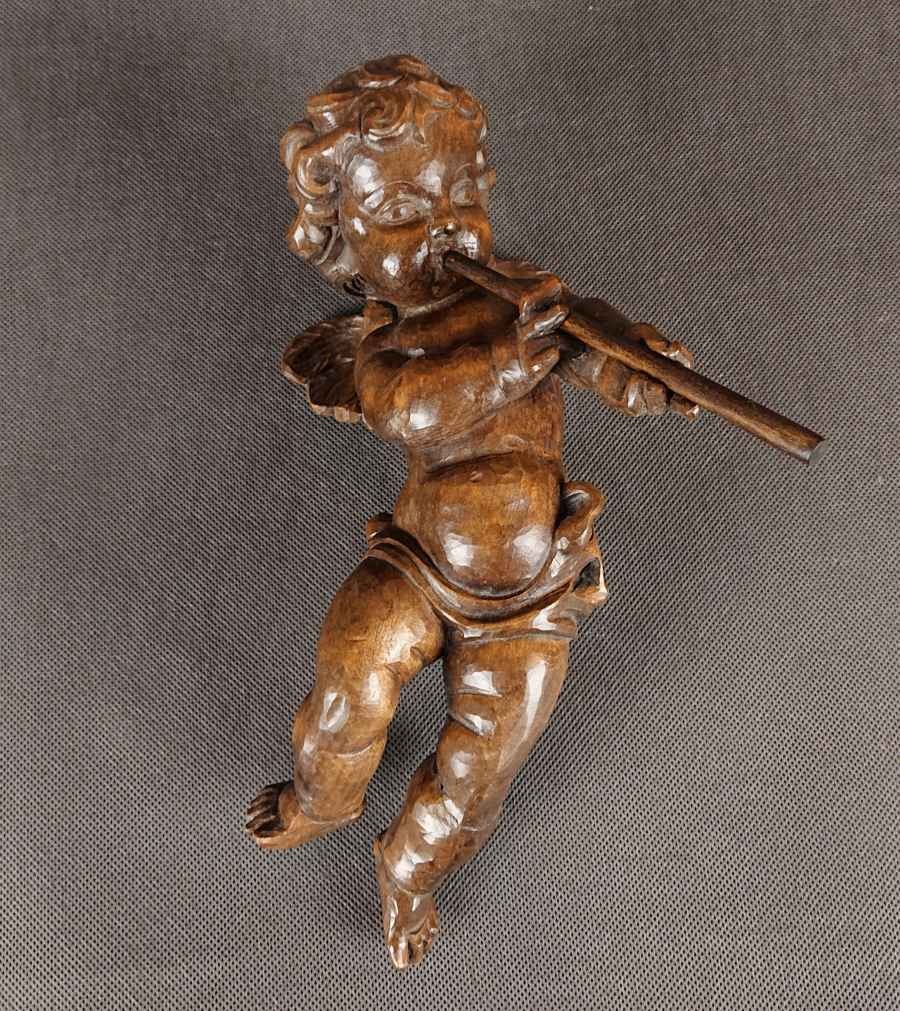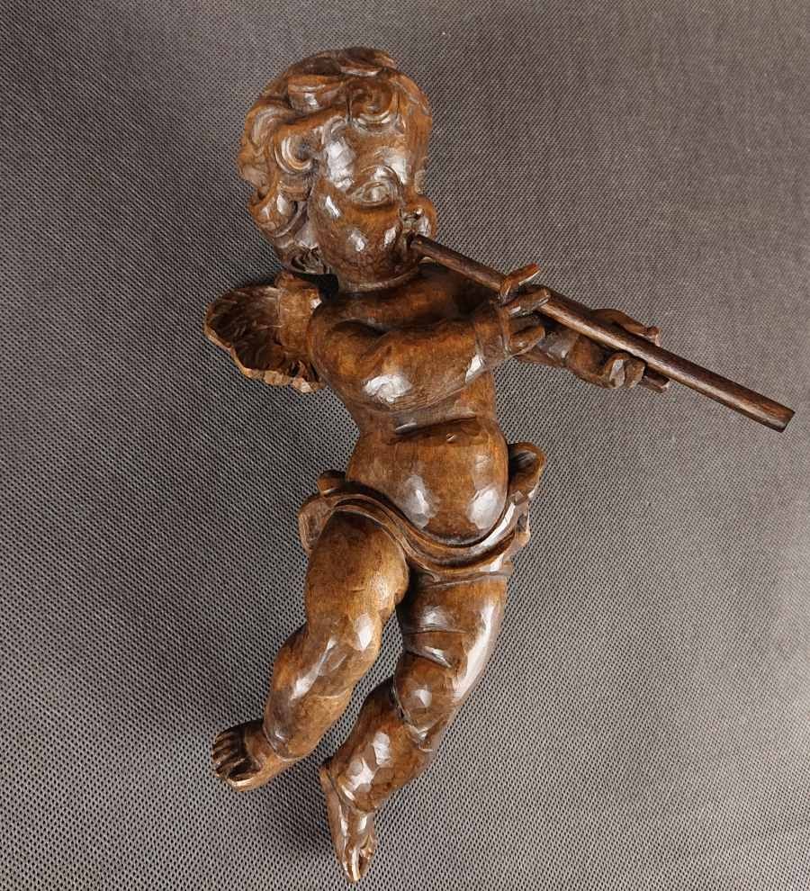 Duża rzeźba, ręcznie wykonana z jednego kawałka ciemnego, polerowanego drewna, ukazuje unoszącego się lekko aniołka w dynamicznej pozie. Smukłe, dziecięce ciało unosi się w powietrzu, wspierane przez subtelnie zarysowane skrzydełka o karbowanych piórach. Aniołek trzyma dwururkę – długi, cienki flet – przy ustach, jakby w pełni oddany grze. Jego pulchna twarz z delikatnie zaznaczonymi policzkami i drobno rzeźbionymi włoskami wyraża skupienie. Drapowane fałdy spódniczki osłaniają biodra, podkreślając ruch nóg, z jedną lekko ugiętą, drugą wyciągniętą za sobą. Warstwowa patyna uwydatnia naturalne pęknięcia słojów, nadając postaci autentyczną głębię i starodawny charakter. Całość harmonijnie łączy realizm anatomiczny z barokową dynamiką, nadając rzeźbie wdzięk i lekkość. Wykonana w latach 40 - 50. XX wieku.