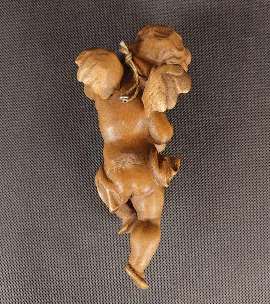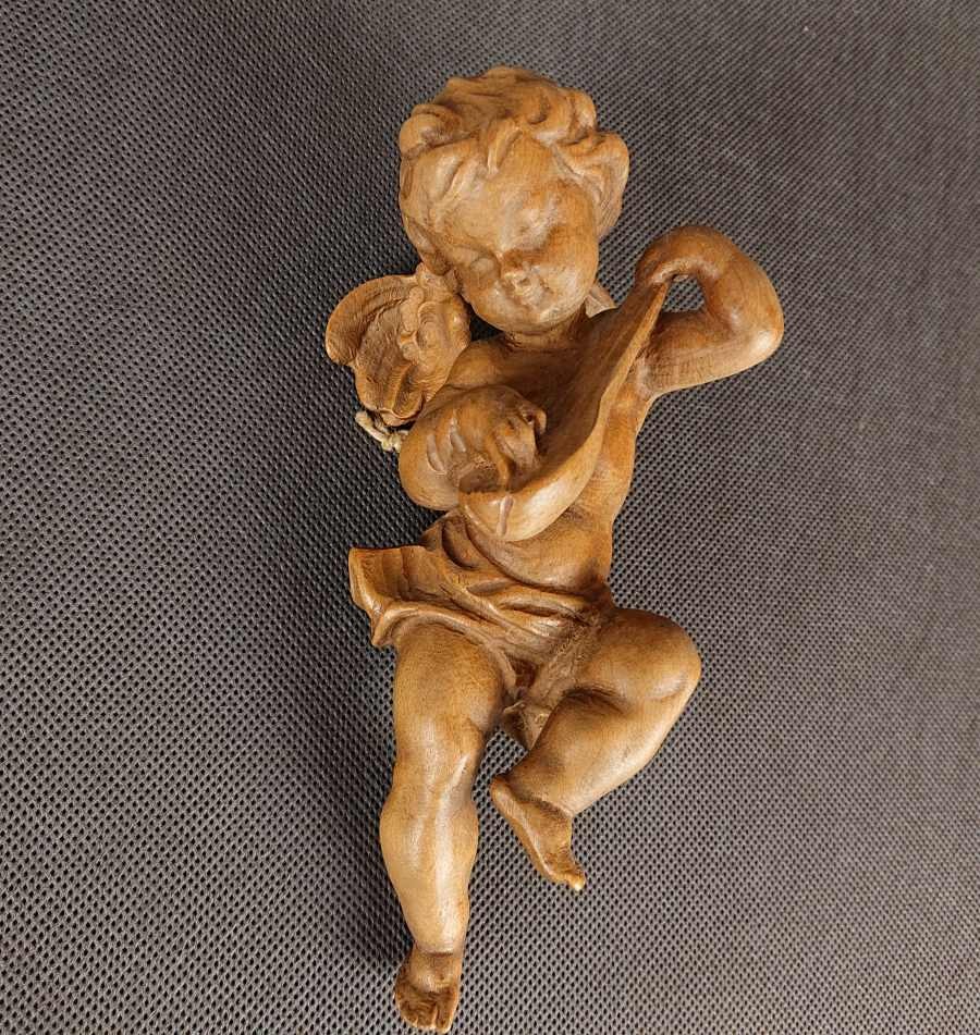 Rzeźba jest trójwymiarowa i pełna detali, mimo niewielkich rozmiarów. Widoczne są rysy twarzy, palce dłoni, fałdy szaty i pióra skrzydeł. Drewno ma ciepły, naturalny odcień z widocznymi słojami, co dodaje rzeźbie uroku. Całość emanuje radością i muzykalnością.