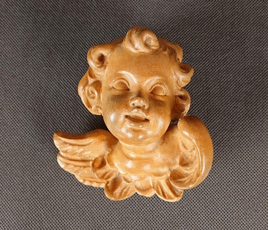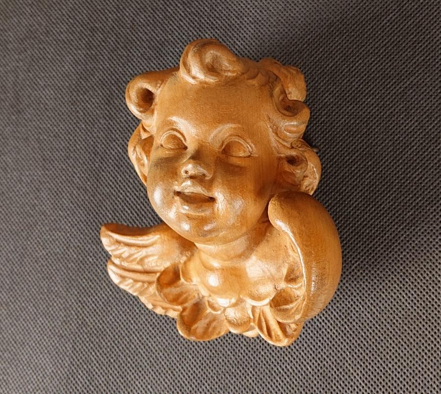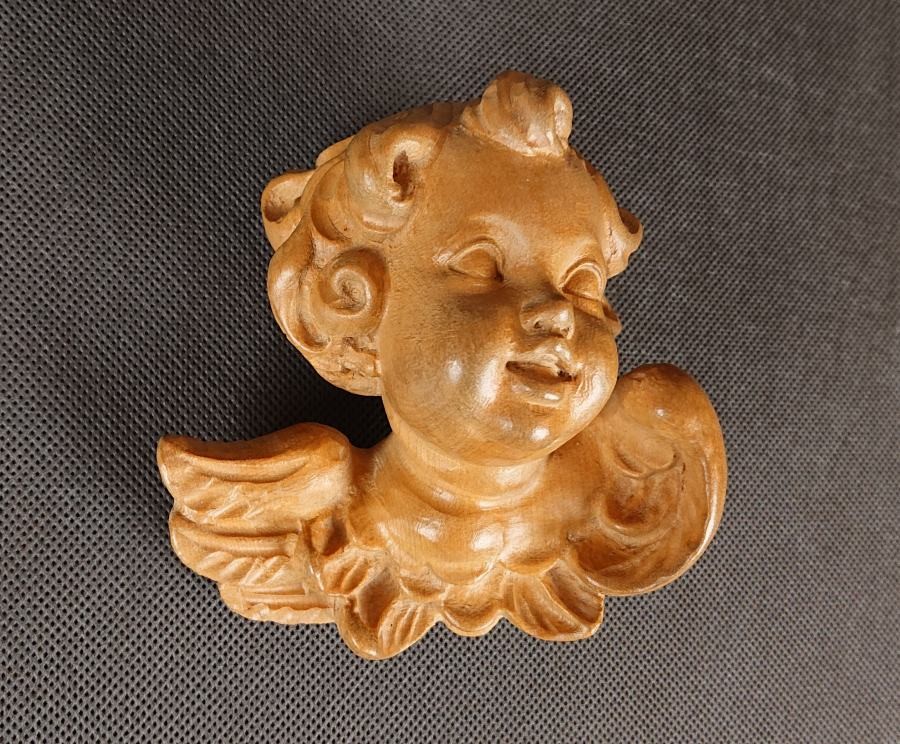 Rzeźba wykonana z jasnego drewna przedstawia uskrzydloną główkę amorka. Twarz cherubina jest okrągła i pełna, z delikatnymi rysami. Oczy są zamknięte, co nadaje mu spokojny i łagodny wyraz. Usta są małe i lekko uśmiechnięte.