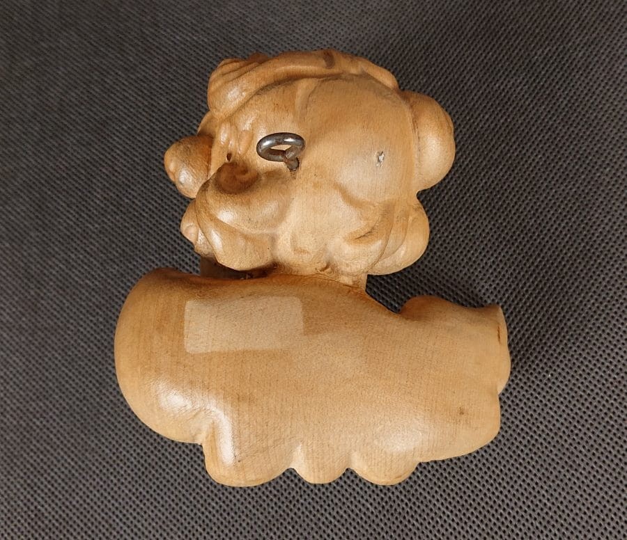 Rzeźba jest trójwymiarowa, choć prawdopodobnie przeznaczona do zawieszenia. Drewno ma naturalny, jasnobrązowy odcień z widocznymi słojami, co dodaje rzeźbie ciepła i naturalnego charakteru.