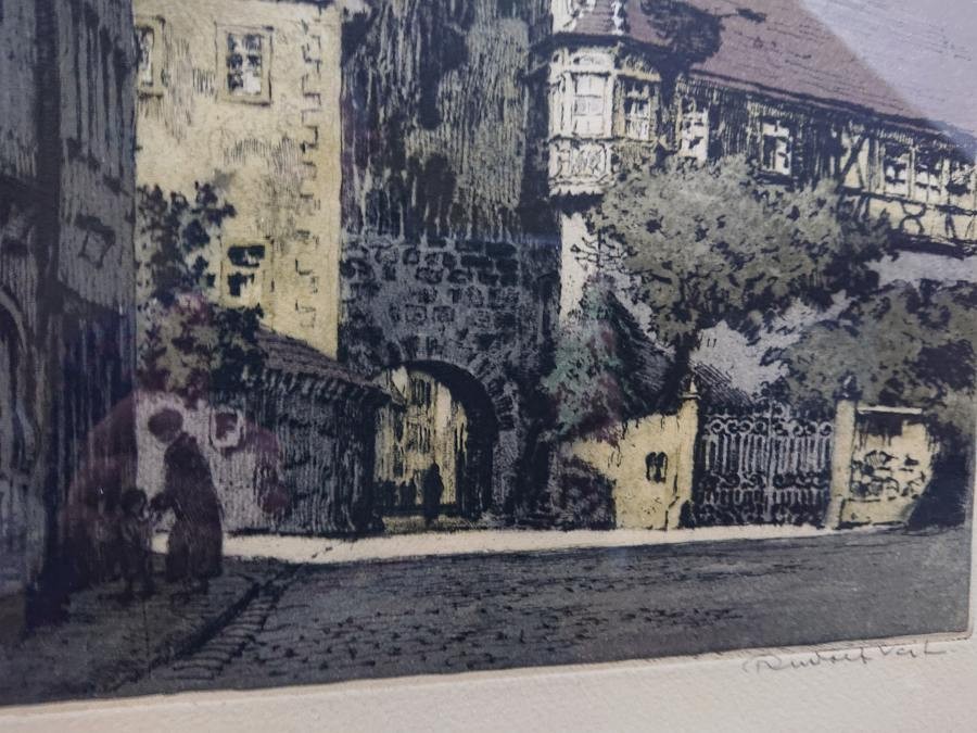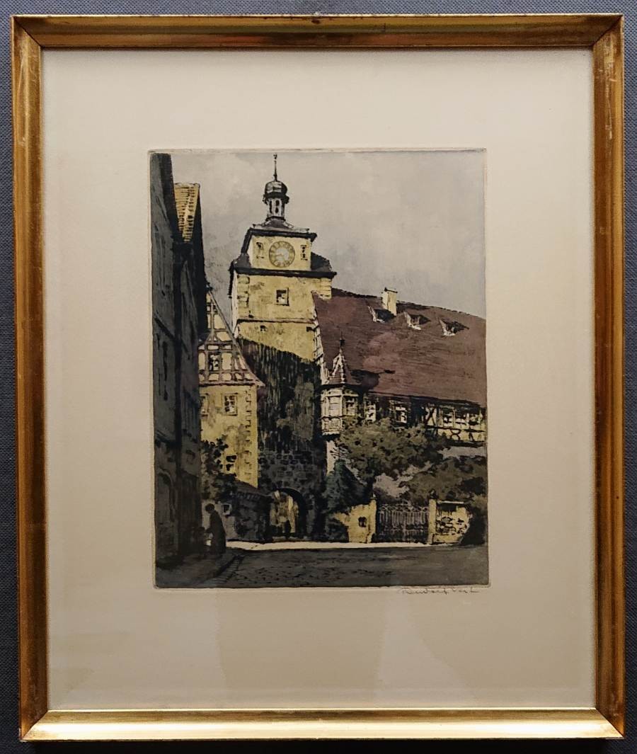 Oryginalna duża grafika wykonana w technice kolorowej akwaforty. Przedstawia uliczkę z historyczną wieżą z zegarem w Rothenburgu. Akwaforta oprawiona w ramę w kolorze złotym, zabezpieczona szybą. Sygnowana odręcznie przez artystę ołówkiem w prawym dolnym narożniku. Gratka dla kolekcjonera grafika rzadko pojawia się na rynku antykwarycznym.