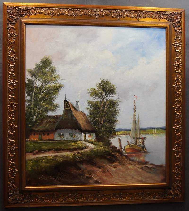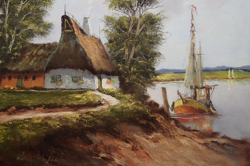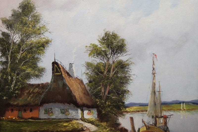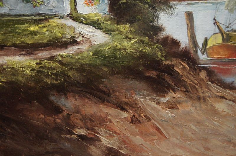 Rybacka osada duży wyśmienity obraz olejny w ramie