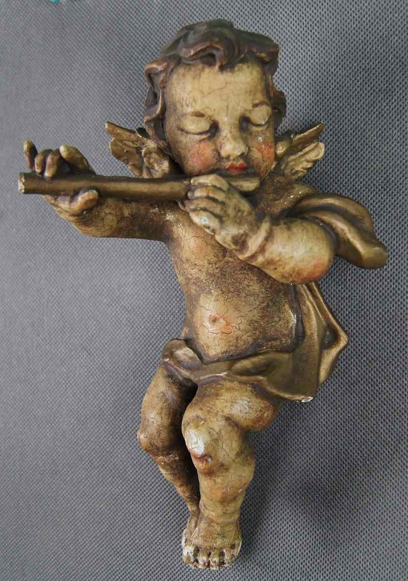 Postać amora, putta, anioła, wyrzeźbiona w drewnie pełnoplastyczna postać amorka, wykończona polichromią. Przedmiot ręcznie wyrzeźbiony w drewnie, odzwierciedlający liczne szczegóły. Pochodzi z Tyrolu niemieckiego lub włoskiego.