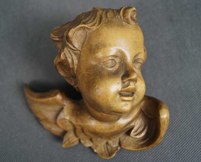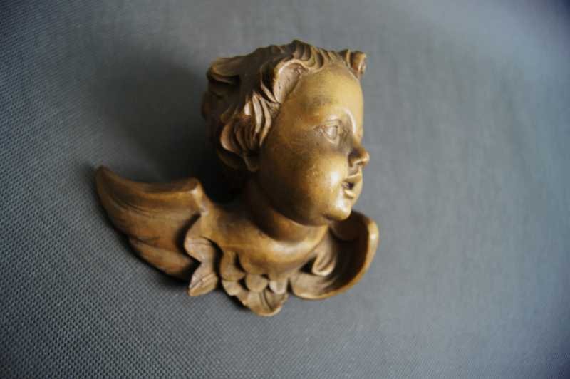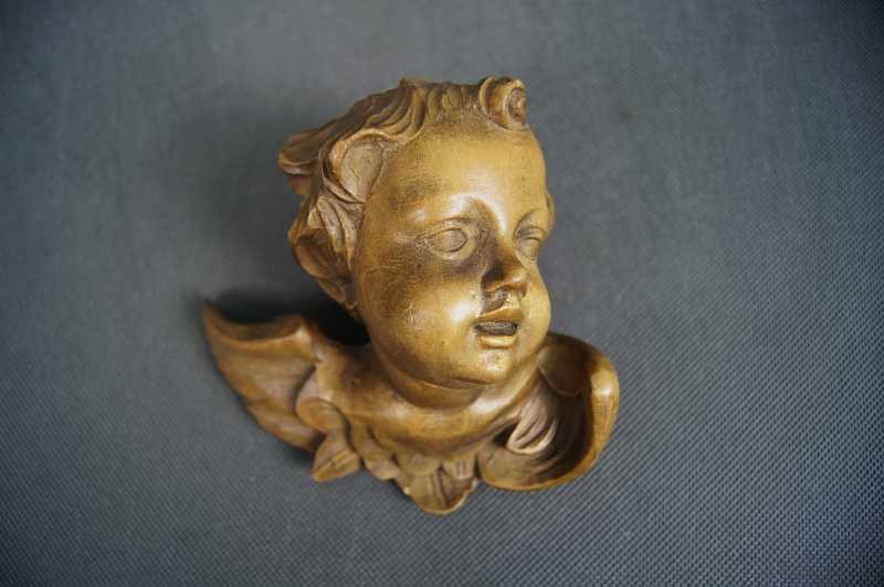 Prześliczna duża głowa cherubinka - aniołka, wykończona politurą i woskiem. Przedmiot ręcznie wyrzeźbiony w drewnie, odzwierciedlający liczne szczegóły. Pochodzi z Tyrolu. Wykonany w latach 60, XX wieku. Piękny cherubinek do kolekcji.STAN ZACHOWANIA: Bardzo dobry