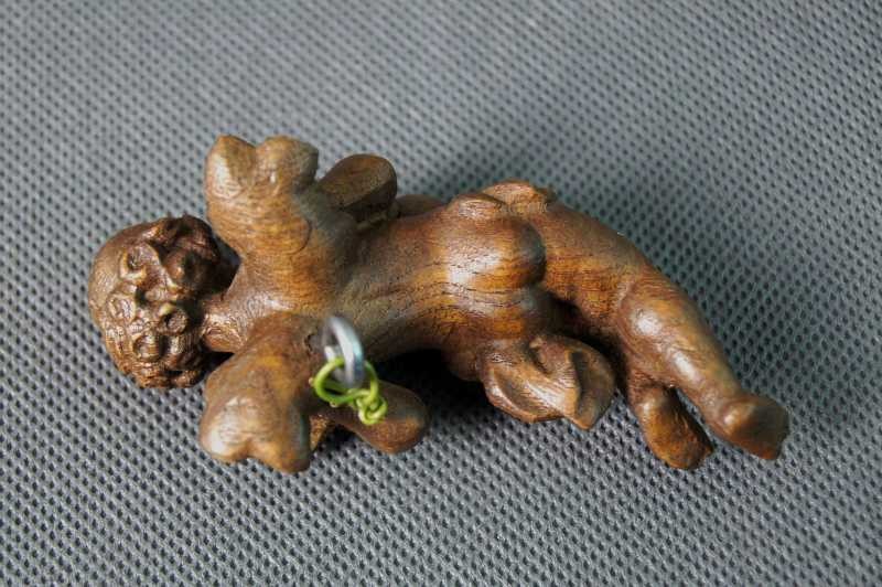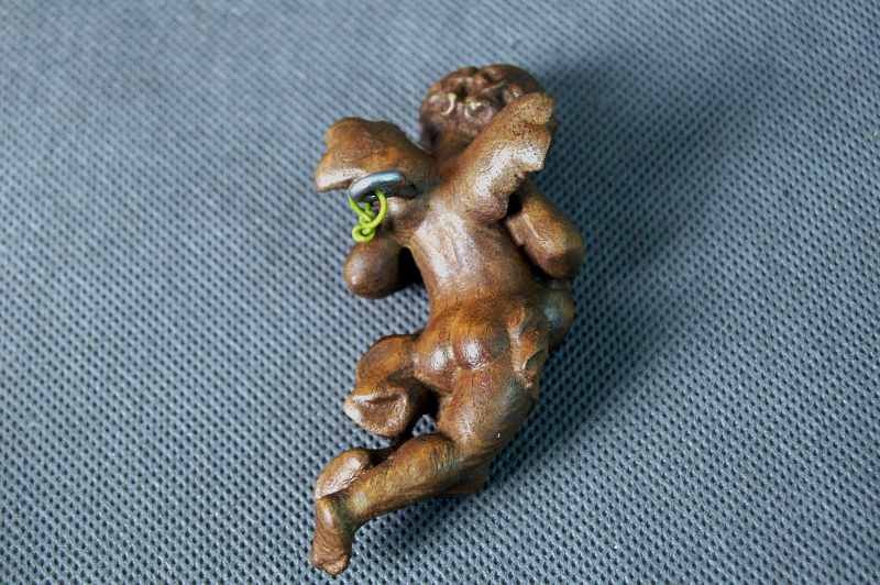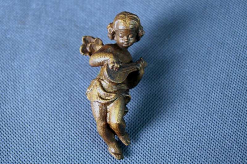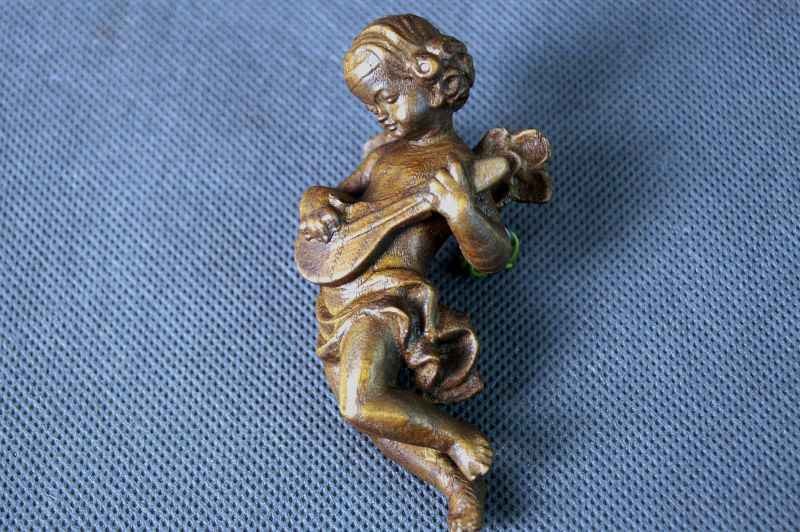 Rzeźba z drewna. Pięknie wykonany w formie pełno plastycznej postaci, przedstawiająca amorka z mandoliną. Przedmioty ręcznie wyrzeźbiony w drewnie jesionowym wykończony woskiem.