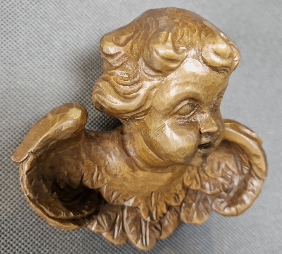 Amorek, aniołek, głowa wyrzeźbiona w drewnie, wykończone politurą i woskiem. Przedmioty ręcznie wyrzeźbione w drewnie, odzwierciedlający liczne szczegóły. Pochodzą z Tyrolu niemieckiego lub włoskiego. Wykonana w latach 60 - 70 XX wieku. Imponujący cherubinek do kolekcji.