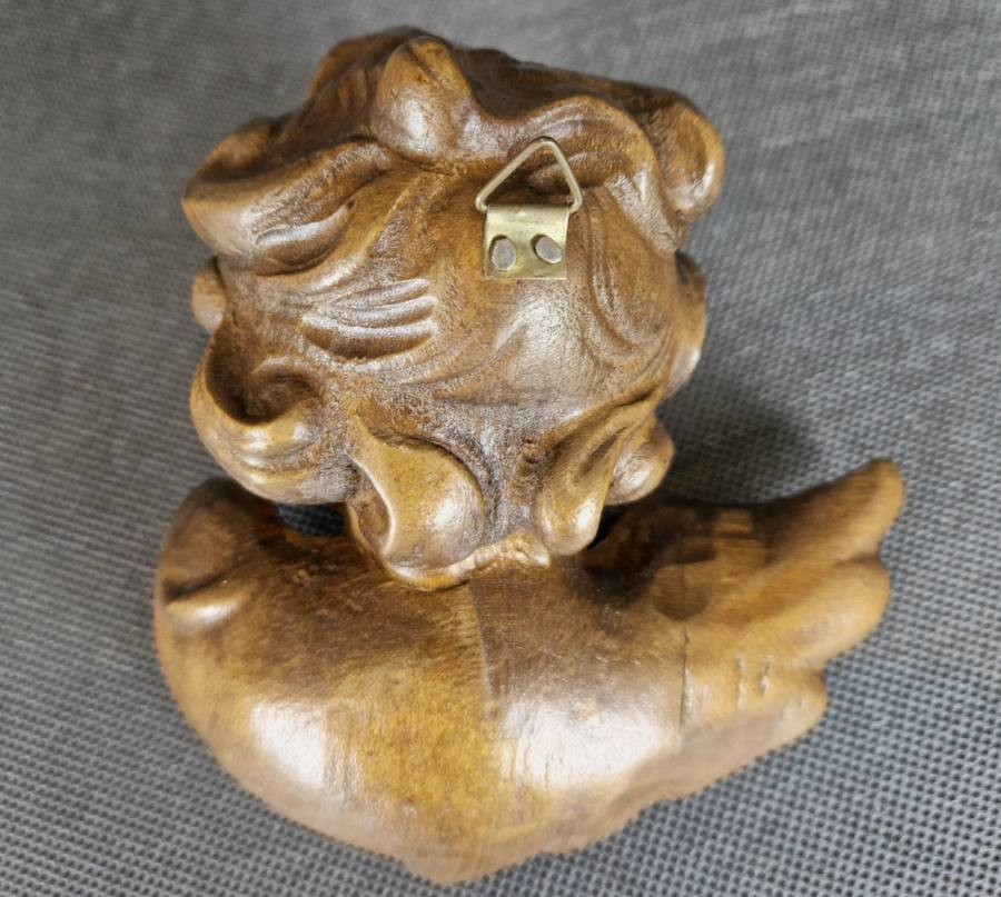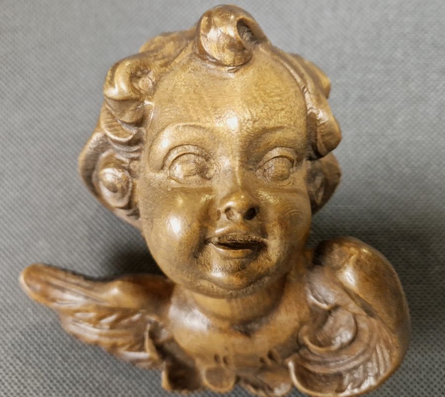 Amorek, aniołek, głowa wyrzeźbiona w drewnie, wykończone politurą i woskiem. Przedmioty ręcznie wyrzeźbione w drewnie, odzwierciedlający liczne szczegóły. Pochodzą z Tyrolu niemieckiego lub włoskiego. Wykonana w latach 60 - 70 XX wieku. Imponujący cherubinek do kolekcji.