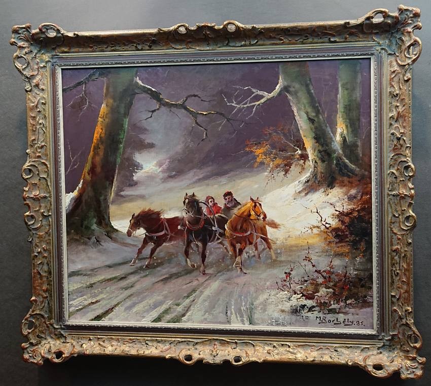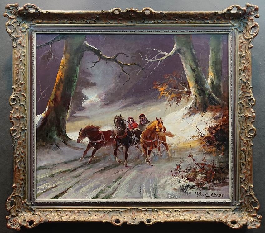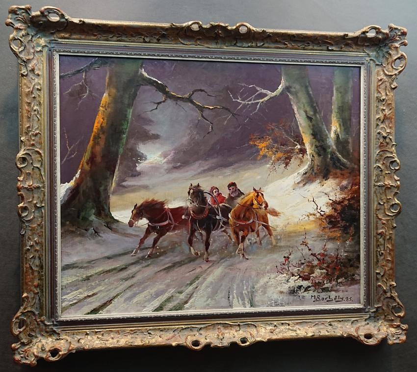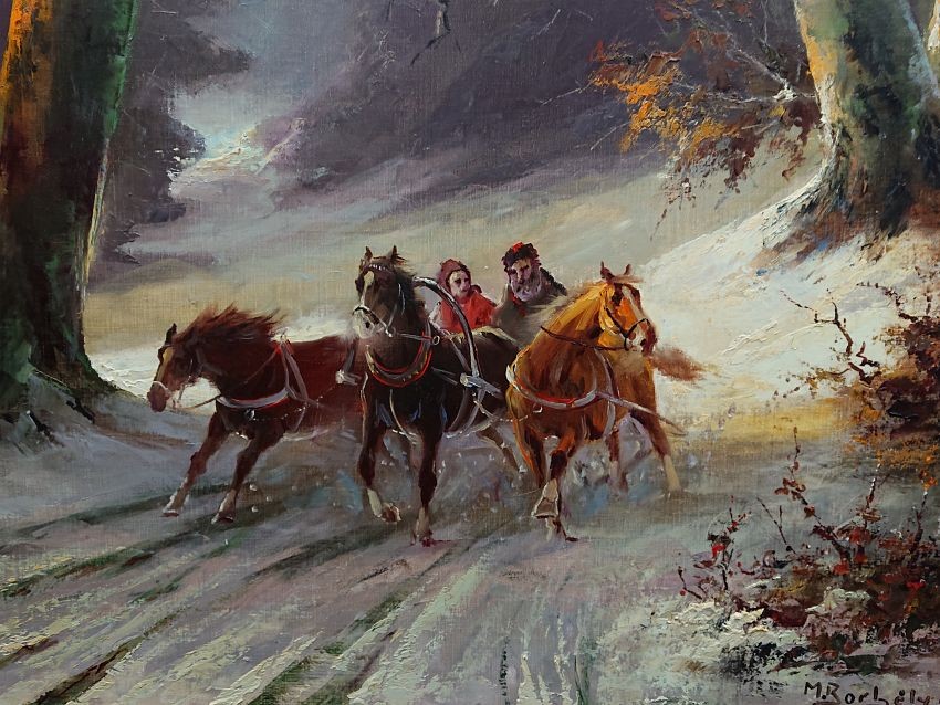Sanie z końmi w galopie ⭐ Michael Borbely malarstwo węgierskie