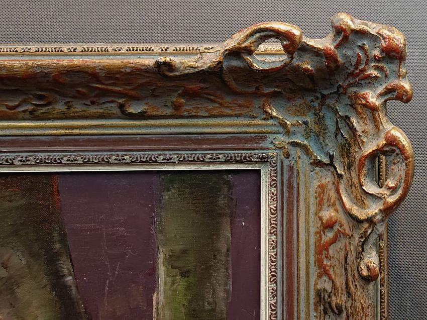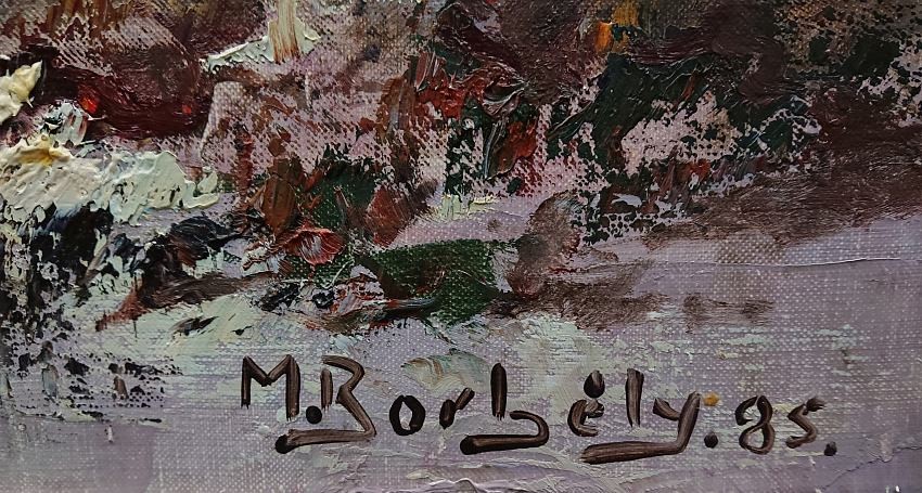 Oryginalne dzieło malowane farbami olejnymi na płótnie w technice pędzla. Niezwykle barwna, pastelowa praca. Wirtuozerskie wręcz operowanie kolorami przez artystę. Sygnowane odręcznie przez autora w prawym dolnym narożniku: M. Borbely. Oprawiony w stylową, gustowną ramę w kolorze patynowanego złota. Obraz o wyjątkowych walorach dekoracyjnych, będzie idealną ozdobą każdego wnętrza. Polecamy koneserom wyszukanego i efektownego malarstwa.