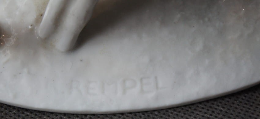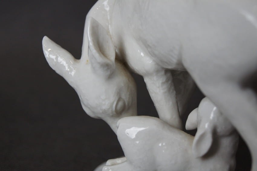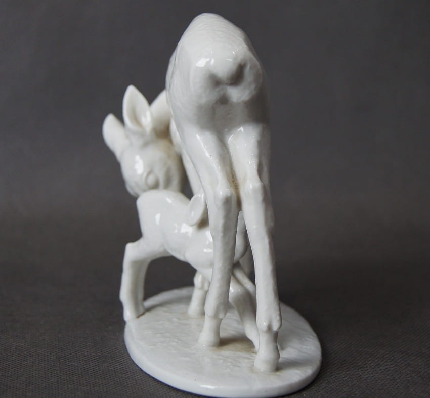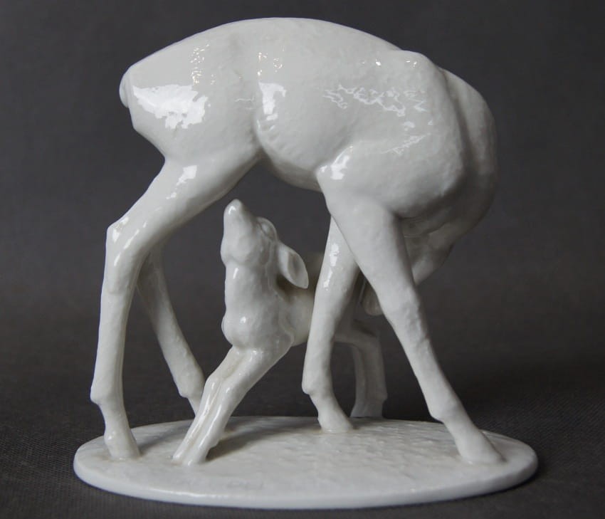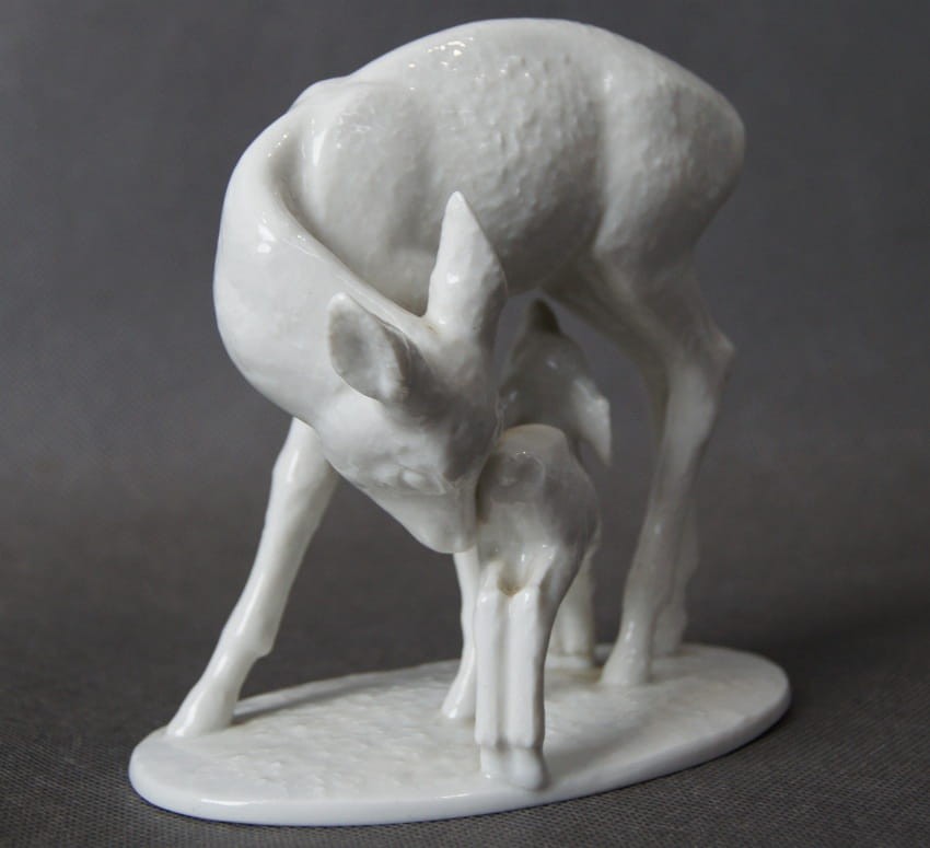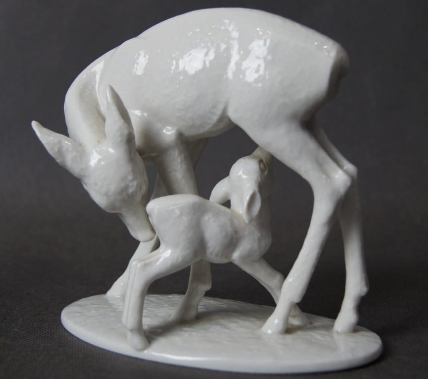 Oryginalna, imponująca duża porcelanowa figurka, przedstawiająca scenę z życia leśnych zwierząt: sarna pochyla się do swojego stojącego obok koźlątka, które sie mleko matki. Figurka jest pełna wdzięku i uroku, a zarazem wiernie oddaje anatomię i wygląd sarny i jej młodego. Znany autor modelu wykazał duże umiejętności artystyczne i rzemieślnicze. Figurka jest datowana na pierwszą połowę XX wieku i wykonana z wysokiej jakości białej porcelany. Rzadko spotykany na rynku wtórnym egzemplarz. Projektantem tej figurki był R. Rempel. Przedmiot idealny do kolekcji.