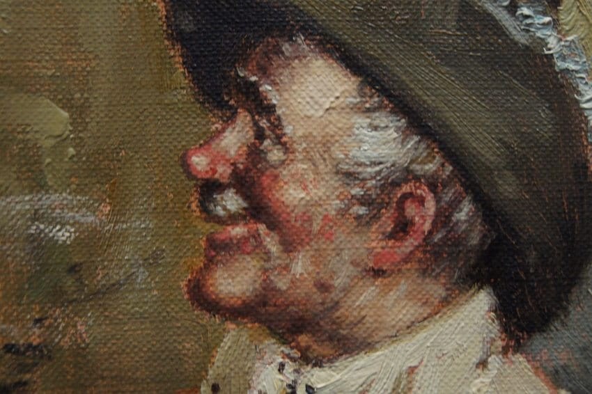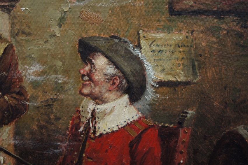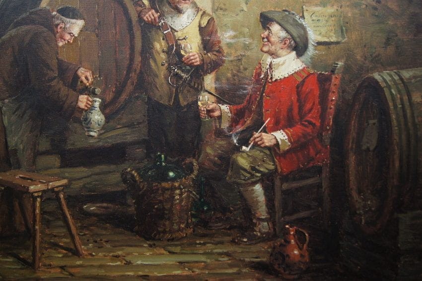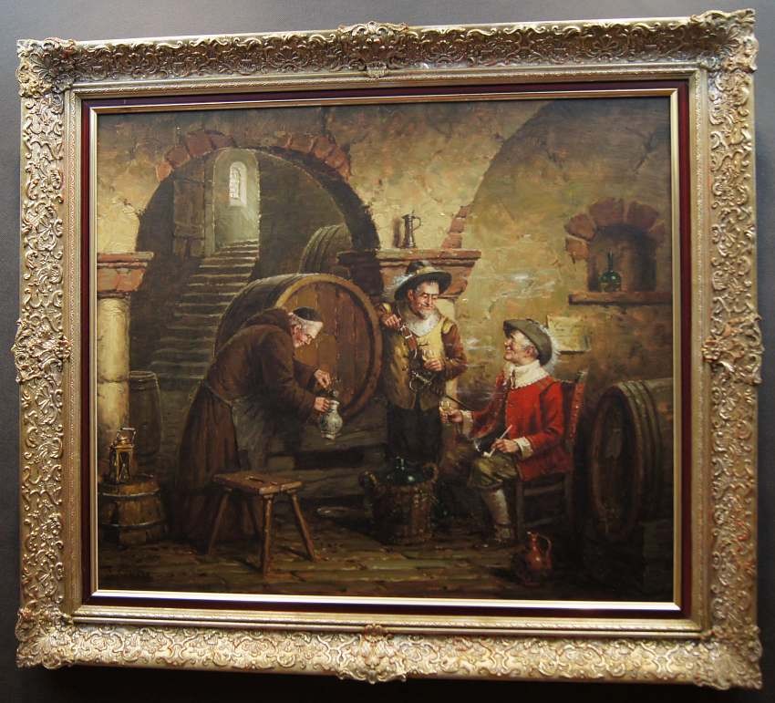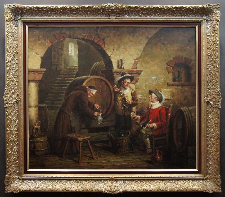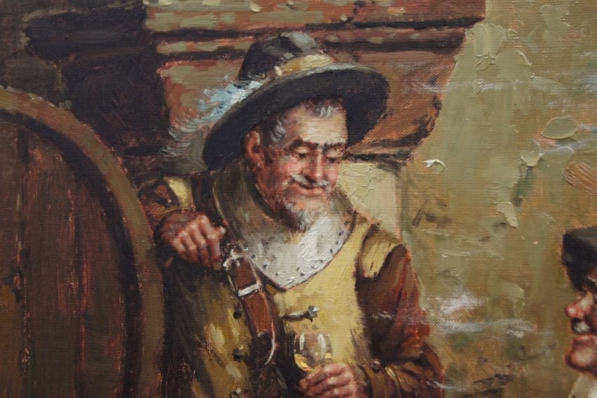 Niezwykle dekoracyjny, oryginalny, duży, perfekcyjnie namalowany obraz olejny na płótnie przedstawiający typowy dla artysty temat z wystawnego życia 18 - wiecznej arystokracji. Artysta uwiecznił scenę degustacji wina u mnicha. Jedno z najlepszych dzieł tego autora. Autorem tej pracy jest aukcyjny artysta Hein Van Doren, sporadycznie tworzący również pod pseudonimem W. Andreas. Obraz malowany w technice pędzla.
