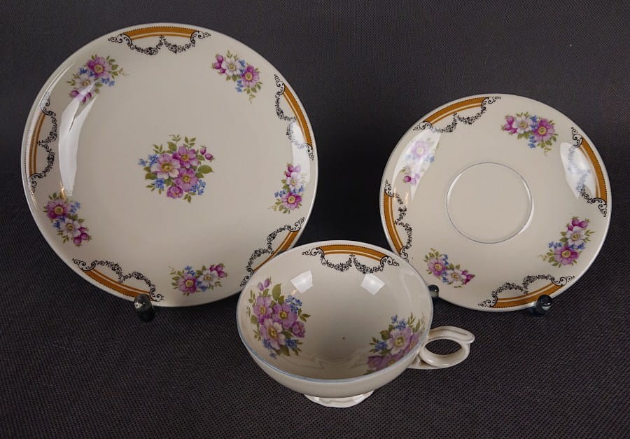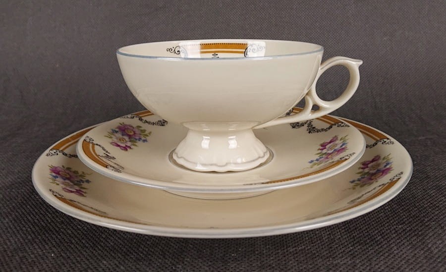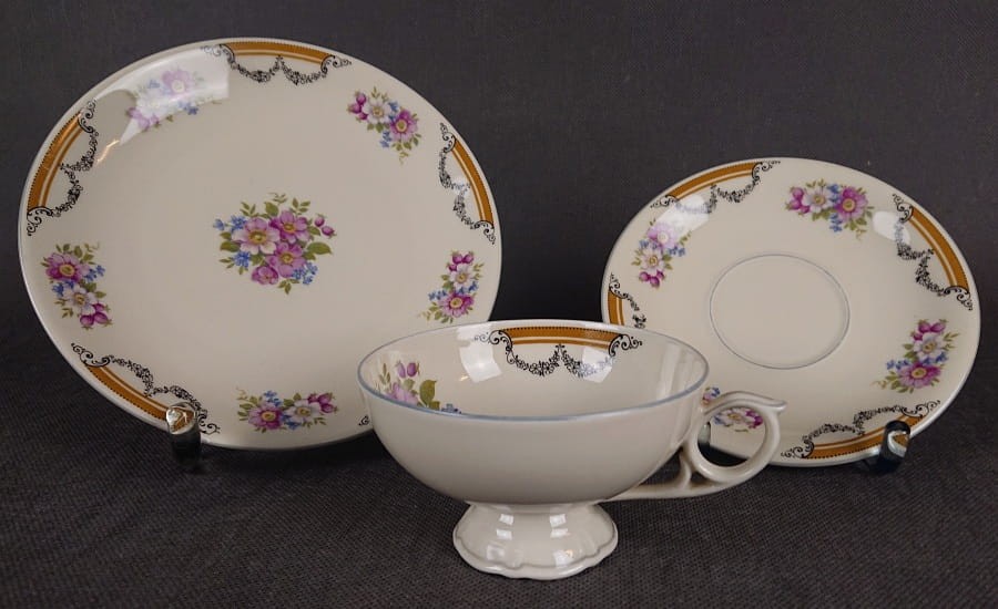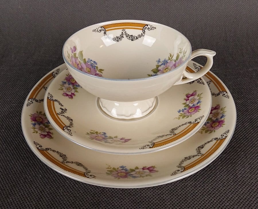 Zestaw śniadaniowy niemieckiej firmy Johann Seltmann z lat 40. XX w. składa się z filiżanki na stopce, małego talerzyka śniadaniowego i talerzyka deserowego. Całość wykonano z kremowej porcelany o subtelnej, lekko wypukłej fakturze. Wnętrze filiżanki oraz ranty talerzy zdobią delikatne girlandy kwiatów w odcieniach lila, różu i błękitu, otoczone asymetrycznymi motywami ornamentalnymi w kolorze imitacji złota i czerni. Filiżanka o eleganckim uszku zwieńczonym drobną spiralką stoi na skromnej, żłobkowanej stopce, która dodaje jej lekkości. Talerzyki wyróżniają się łagodnie zaokrąglonym brzegiem z kilkoma poprzecznymi, złotymi paskami i misterną czarną linią. Cały komplet łączy klasyczną formę z dyskretną dekoracją, idealną do porannej kawy lub herbaty w stylu retro. Cały zestaw prezentuje niezwykle elegancko. Idealny do kolekcji. Elegancja i wysublimowany kształt zestawu, uprzyjemni każdą chwilę przy śniadaniu czy podwieczorku.Pochodzenie: Sygnatura stosowana w latach 1917 - 1942.