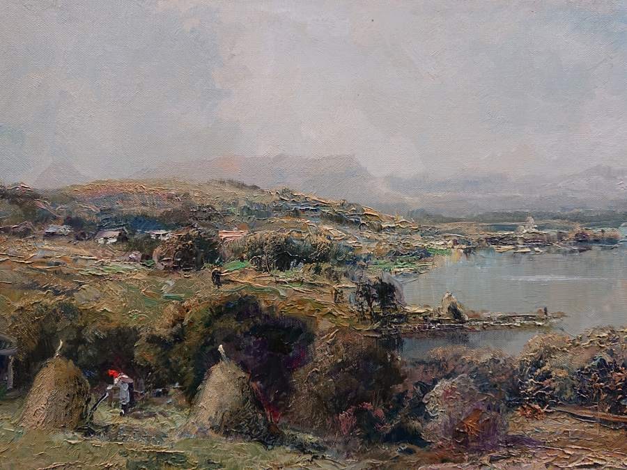 Obraz autorstwa niemieckiego malarza Ludwiga Gschossmanna przedstawia malowniczy, sielankowy pejzaż, który emanuje spokojem i harmonią natury.Kompozycja obrazu ukazuje szeroki widok na wiejski krajobraz z akcentem wodnym w centrum. W oddali rozciąga się rzeka, otoczona niskimi wzgórzami i porośnięte bujną roślinnością. Na pierwszym planie widoczne są łąki z charakterystycznymi stogami siana, które wprowadzają element życia wiejskiego. Po lewej stronie można dostrzec niewielkie zabudowania i postać w czerwonym ubraniu, co dodaje scenie subtelnego dynamizmu.